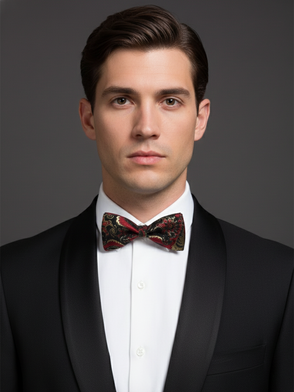 Add a touch of royal elegance to your outfit with this Black Bow Tie featuring exquisite red and golden embroidery. Designed for special occasions, festive events, weddings, and formal parties, this bow tie blends classic black sophistication with rich ethnic detailing. Crafted from premium-quality fabric, it offers a comfortable fit and a refined finish that elevates both traditional and Indo-western looks.
