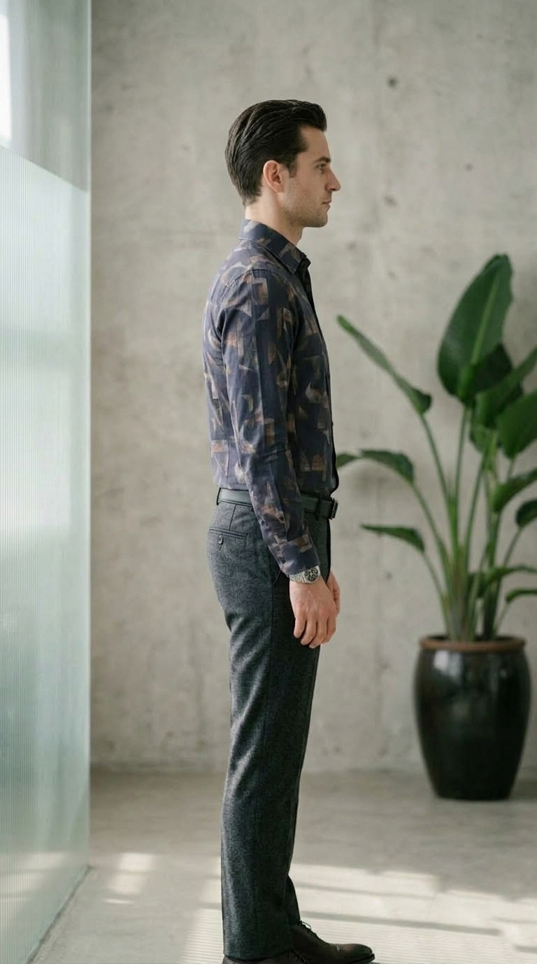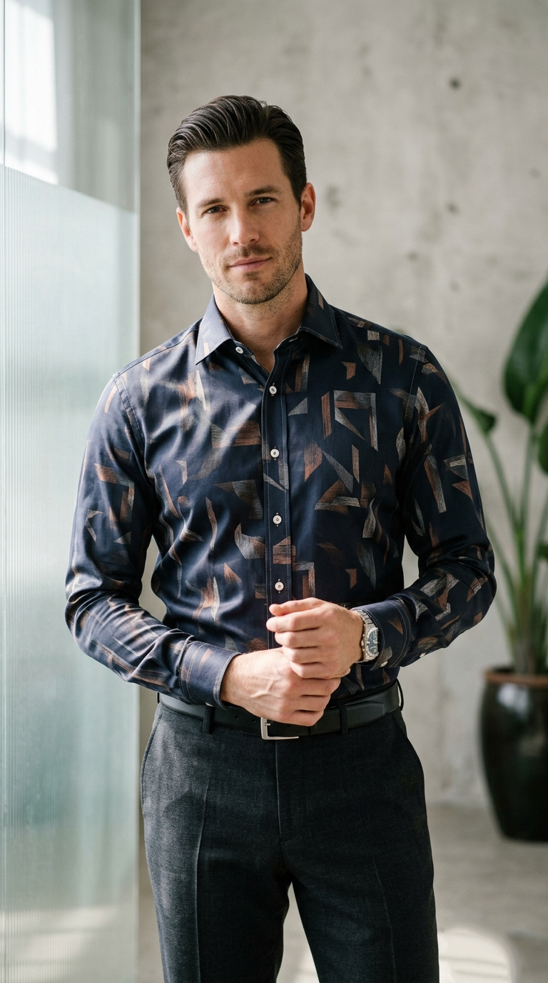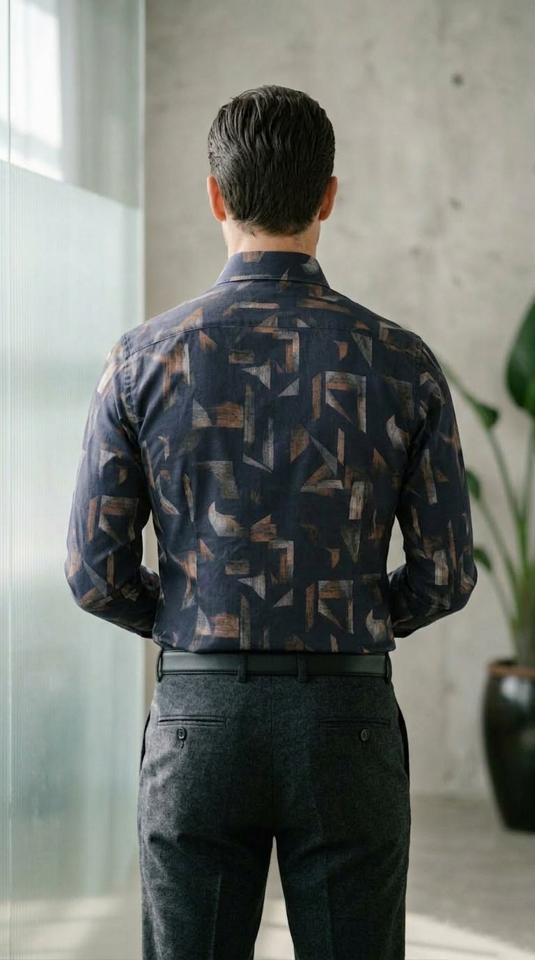 Infuse your wardrobe with modern artistry with this designer long-sleeve dress shirt. Featuring an edgy, deconstructed geometric motif, the design uses fragmented shapes in shades of copper, slate, and charcoal over a deep navy base. The “shattered glass” aesthetic provides a dynamic visual energy, making it a standout choice for the creative professional. Tailored for a crisp, contemporary fit, this shirt transitions perfectly from an afternoon gallery visit to a high-end evening cocktail hour.