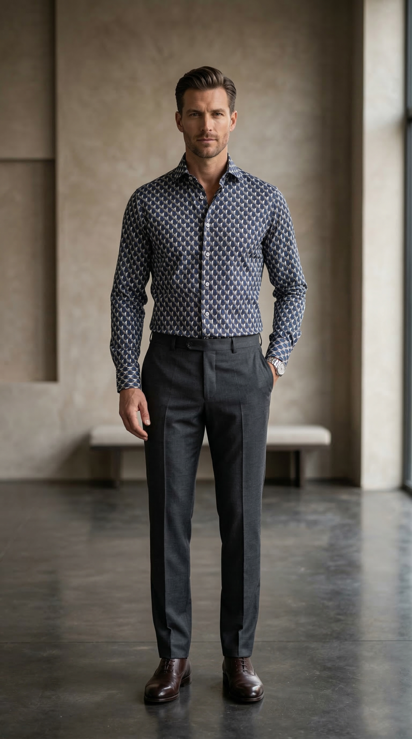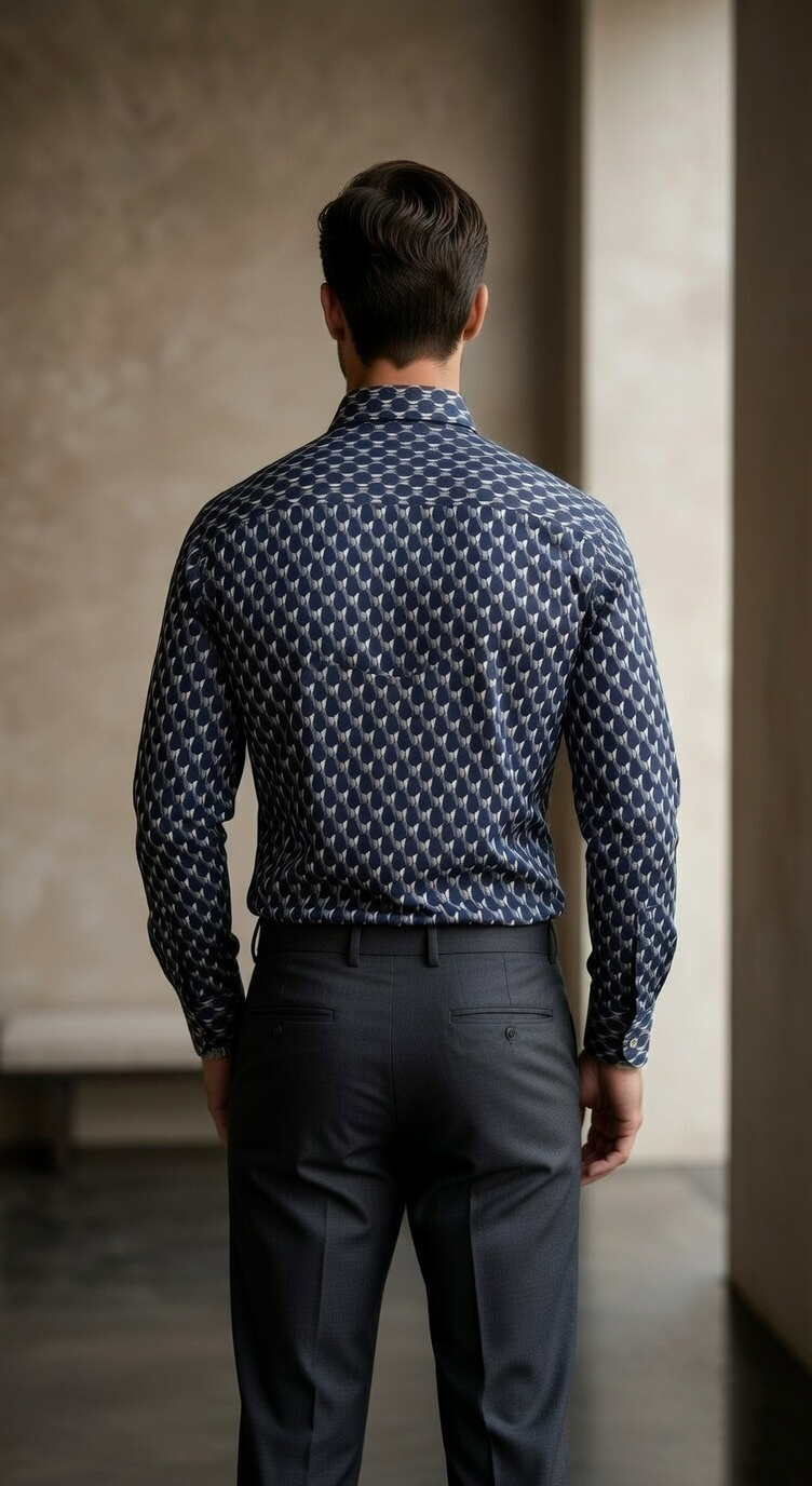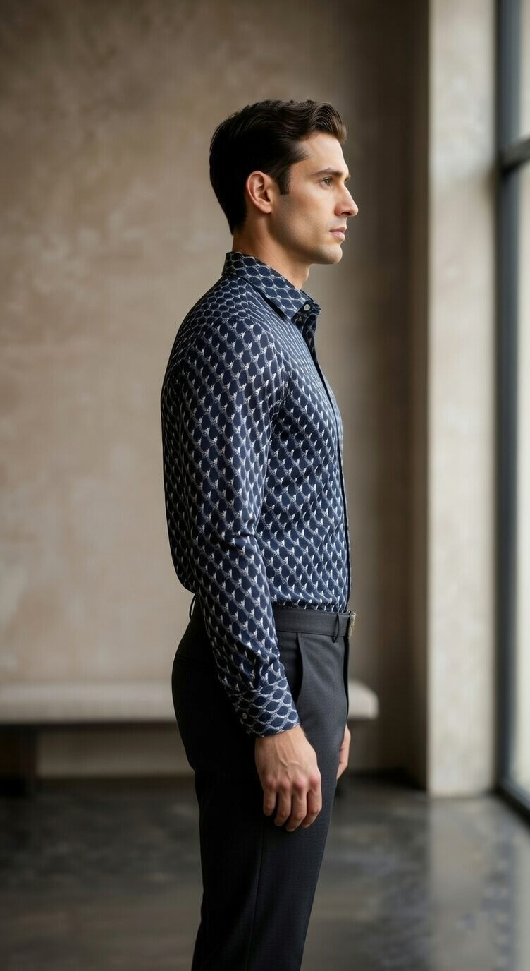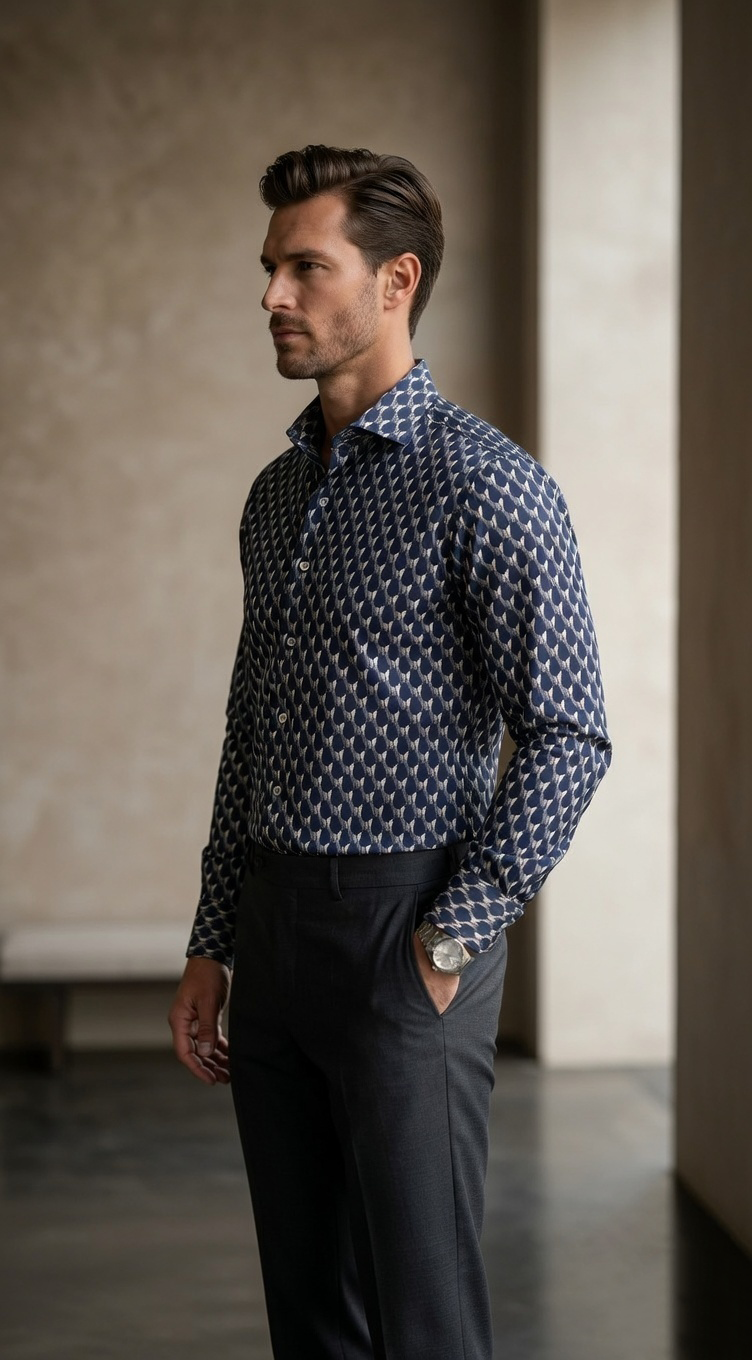 Step into a new dimension of style with this designer long-sleeve shirt, showcasing a captivating 3D-effect geometric print. The repeating hexagonal motif creates a sophisticated visual depth using a palette of deep navy, slate grey, and crisp white. Expertly tailored for a clean, streamlined fit, this shirt is designed for the modern professional who wants a sharp, mathematical precision to their look. It pairs exceptionally well with charcoal tailored trousers for a cohesive, high-end aesthetic.