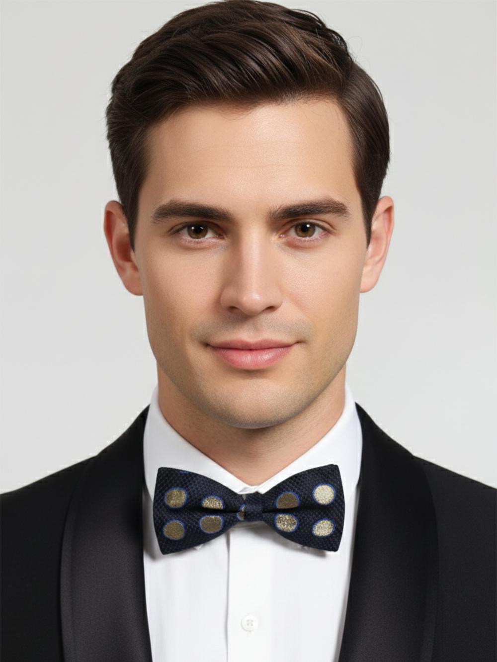 Elegant Blue Silk bow Tie with Golden Circle Pattern ? Classic Formal Wear Accessory
