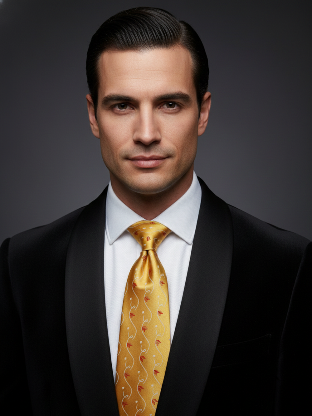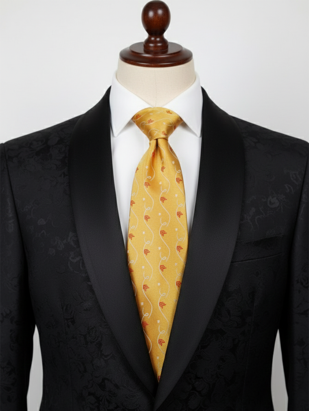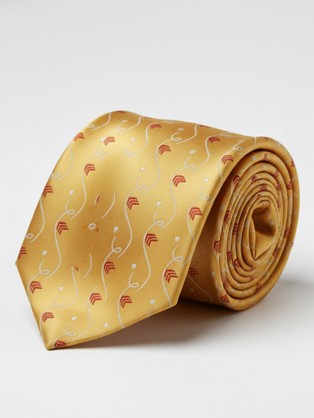 Make a refined style statement with this luxury golden silk tie featuring elegant red and white printed accents. Crafted from premium-quality silk, this tie blends a rich golden base with classic contrasting prints, creating a sophisticated yet eye-catching look. Ideal for weddings, festive occasions, formal events, and evening parties, it adds warmth, elegance, and character to any formal outfit.
