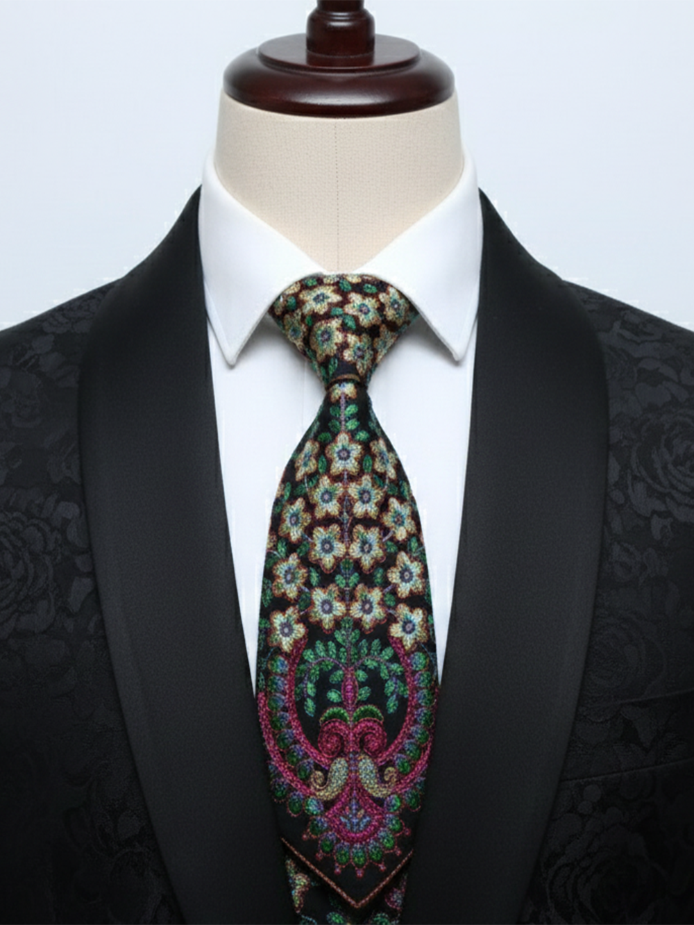 Elevate your formal wardrobe with this exquisitely crafted luxury silk tie. Made from premium-quality silk, this tie features an intricate floral motif inspired by classic artistry, beautifully embroidered in rich jewel tones. The deep black base adds timeless elegance, while the detailed design makes it a refined statement piece for weddings, business events, and evening occasions.