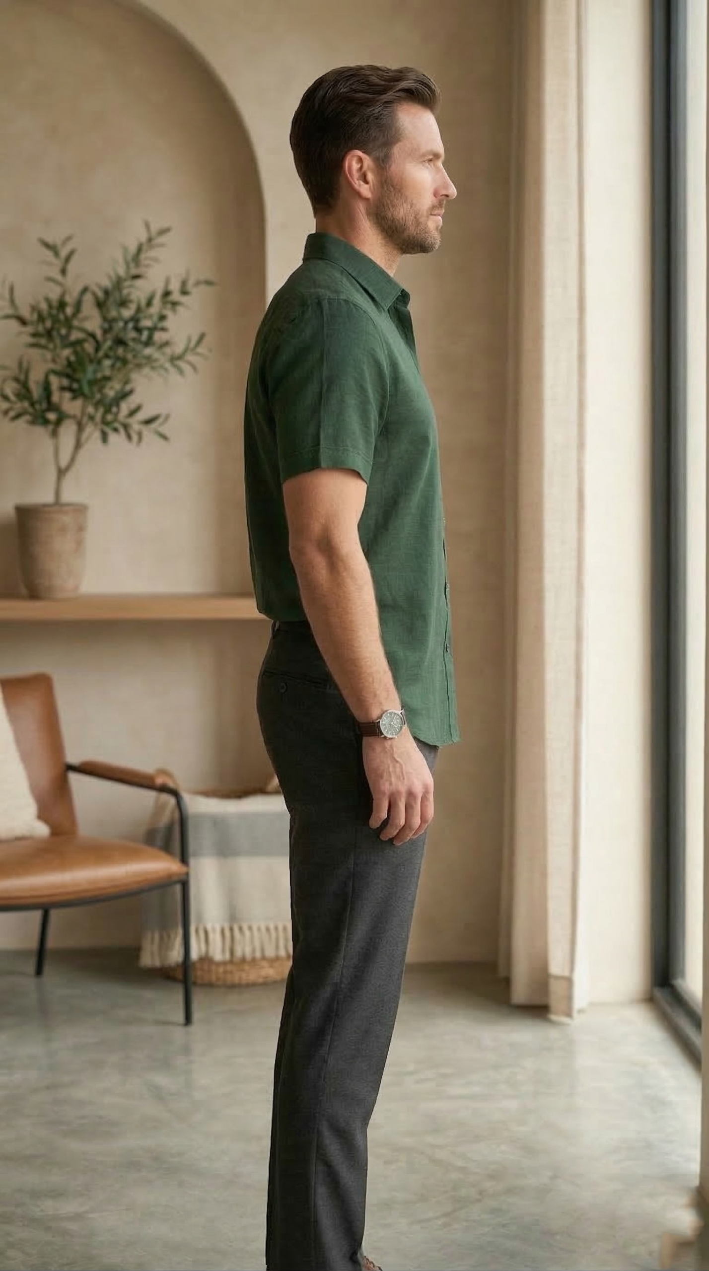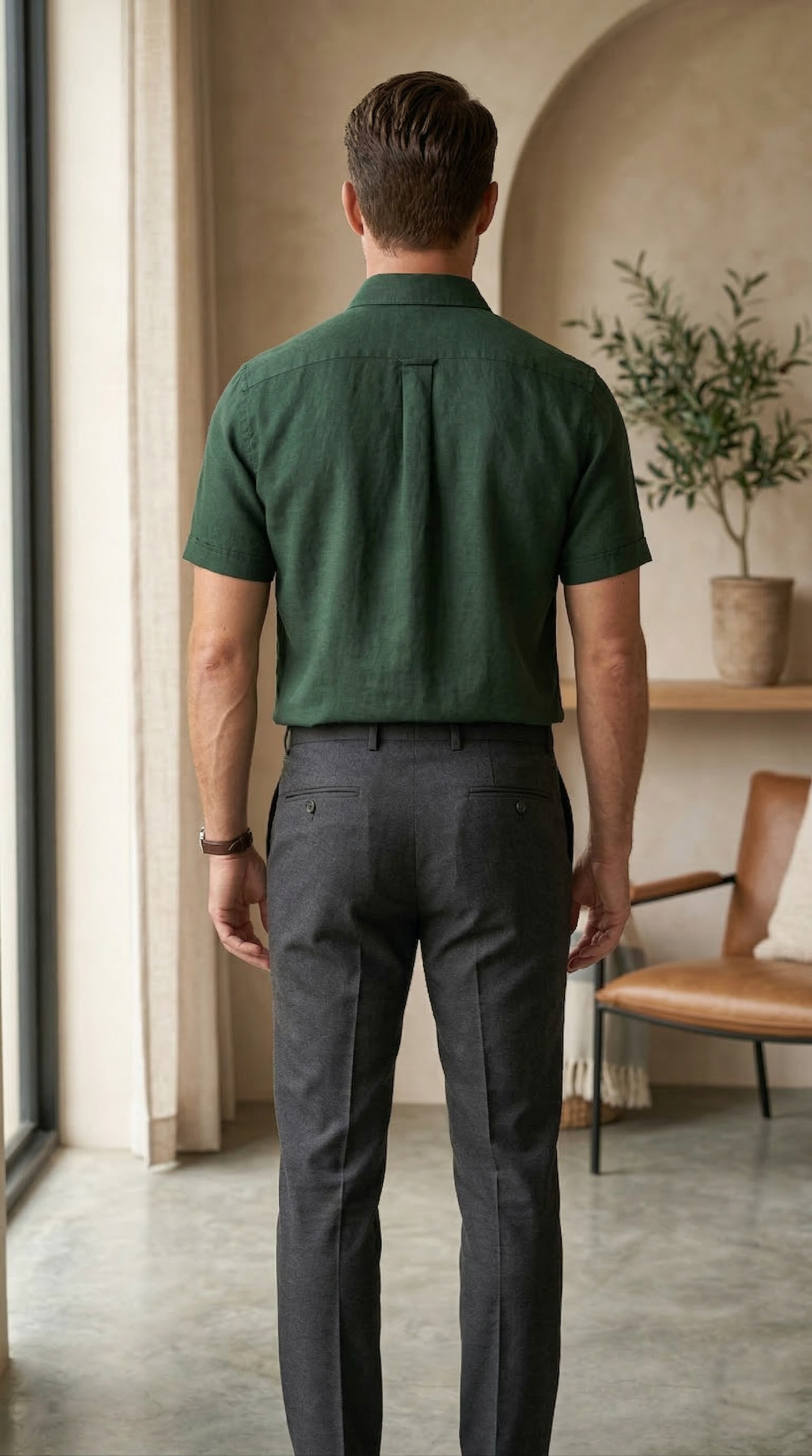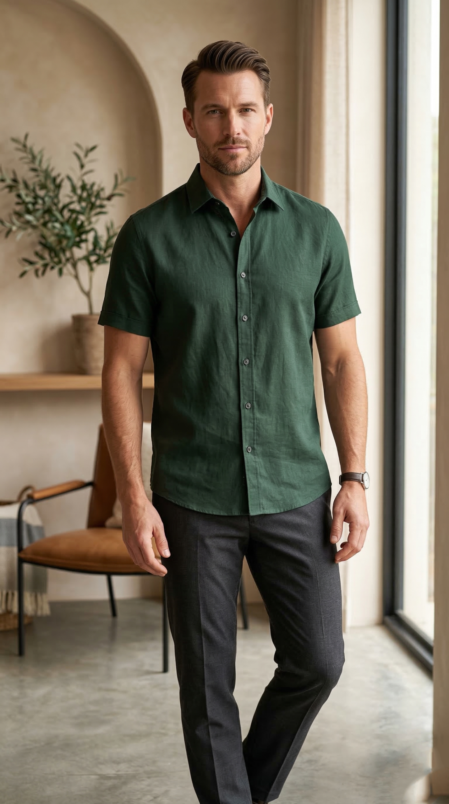 Men’s Casual Short-Sleeve Linen Shirt in Hunter Green