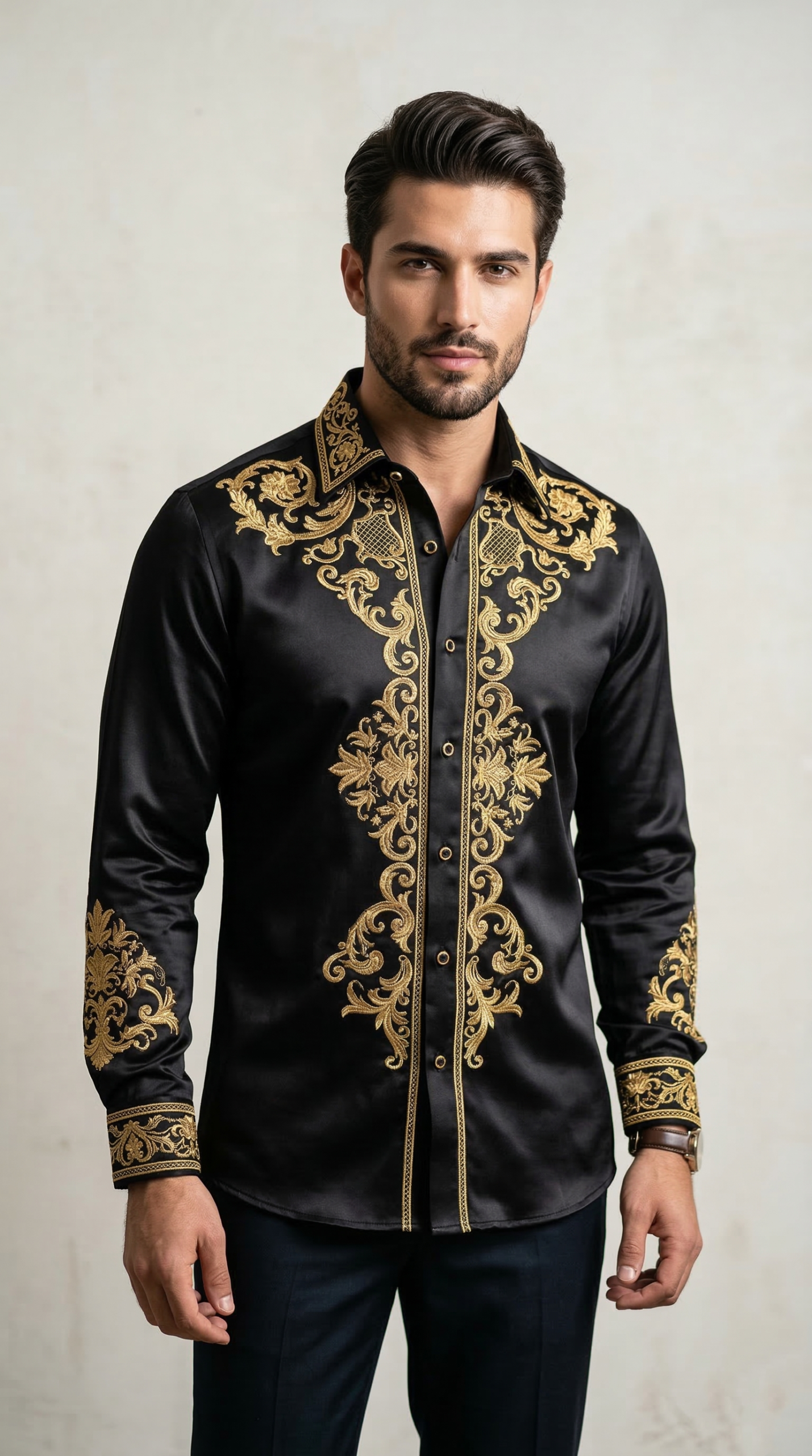 Exude unmatched opulence with this signature designer evening shirt. A masterclass in luxury craftsmanship, this piece features intricate filigree gold embroidery meticulously placed along the shoulders, placket, and cuffs. The ornate scrollwork draws inspiration from classic European Baroque artistry, making it a definitive statement piece for the modern gentleman.