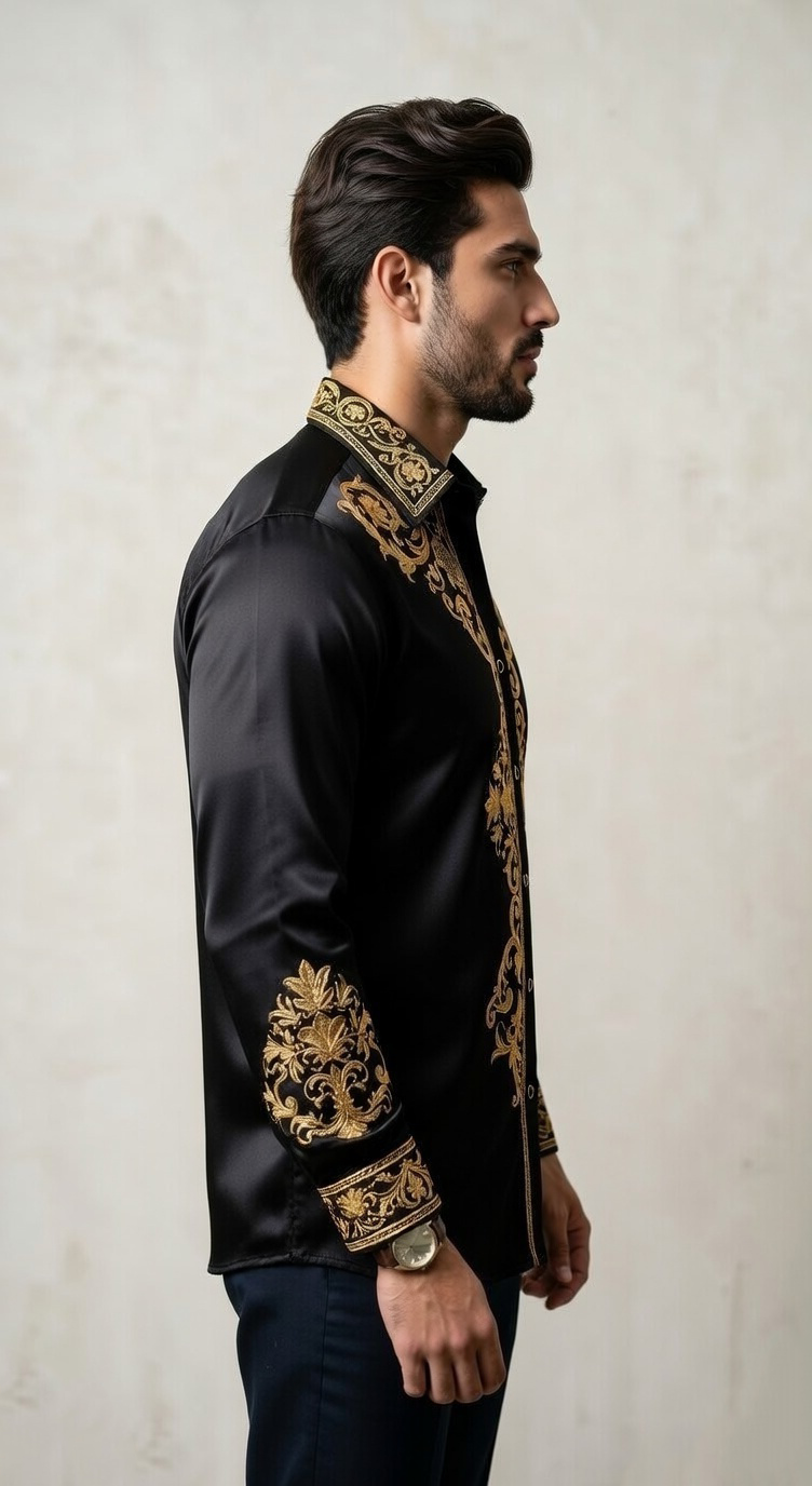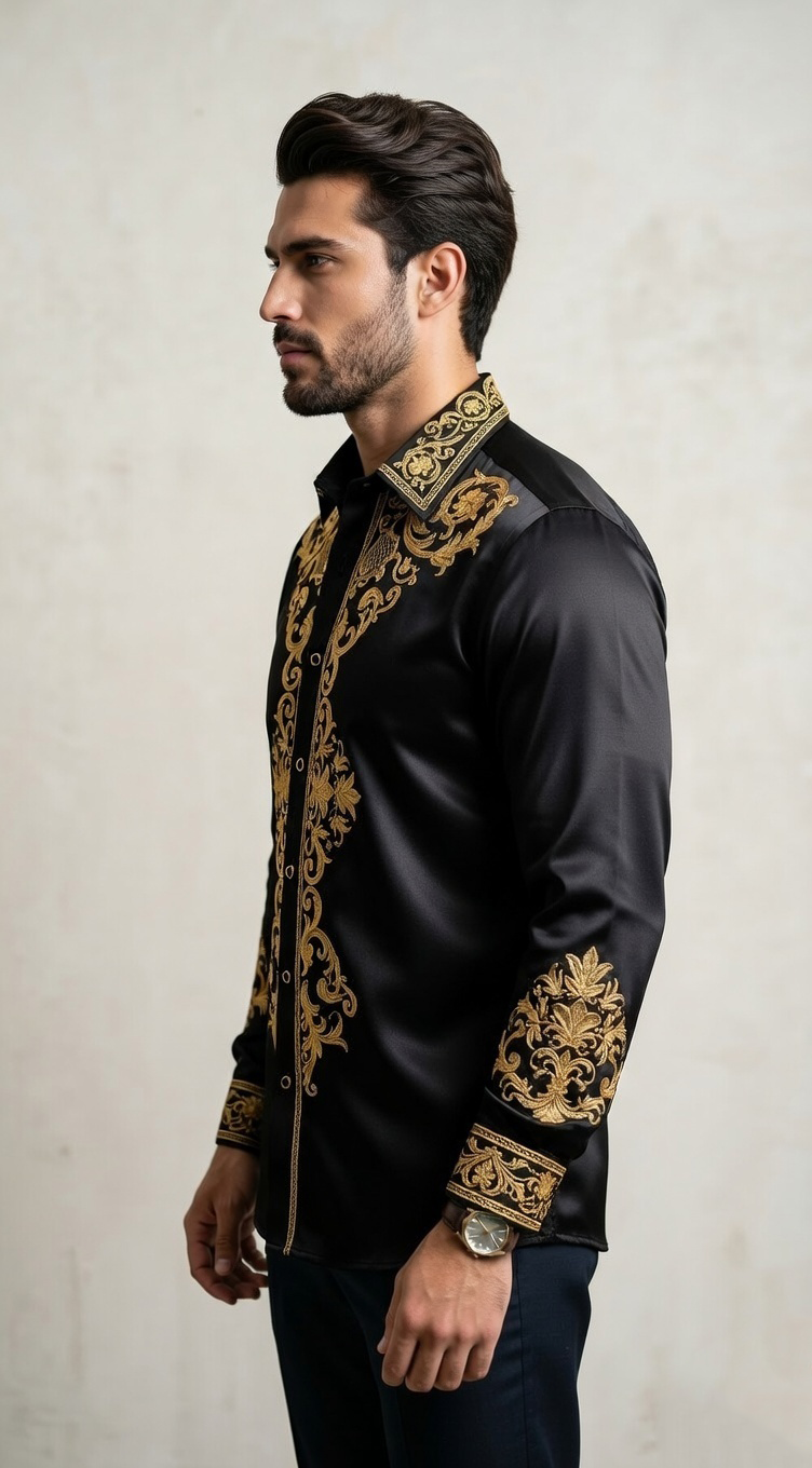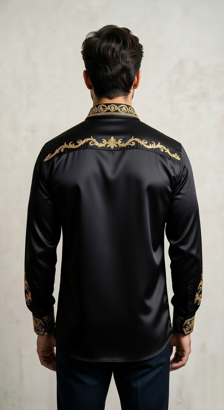 Constructed from a premium designer silk-sateen blend, the fabric offers a liquid-like sheen and a smooth, tailored drape. The contrast between the deep matte-black base and the radiant gold stitching creates a three-dimensional visual impact. Completed with a structured point collar and gold-rimmed hardware, this shirt is designed for high-profile events where making an impression is non-negotiable.