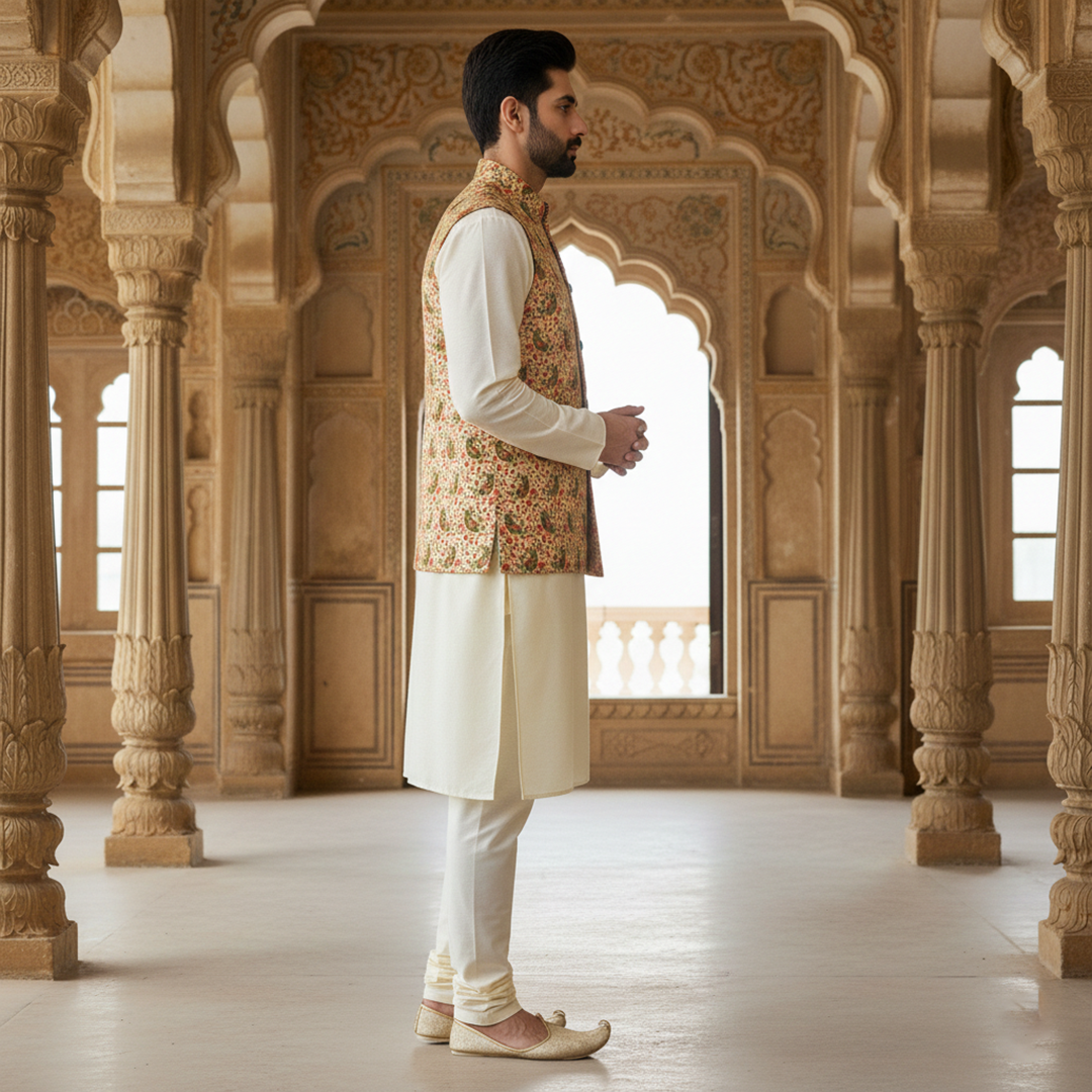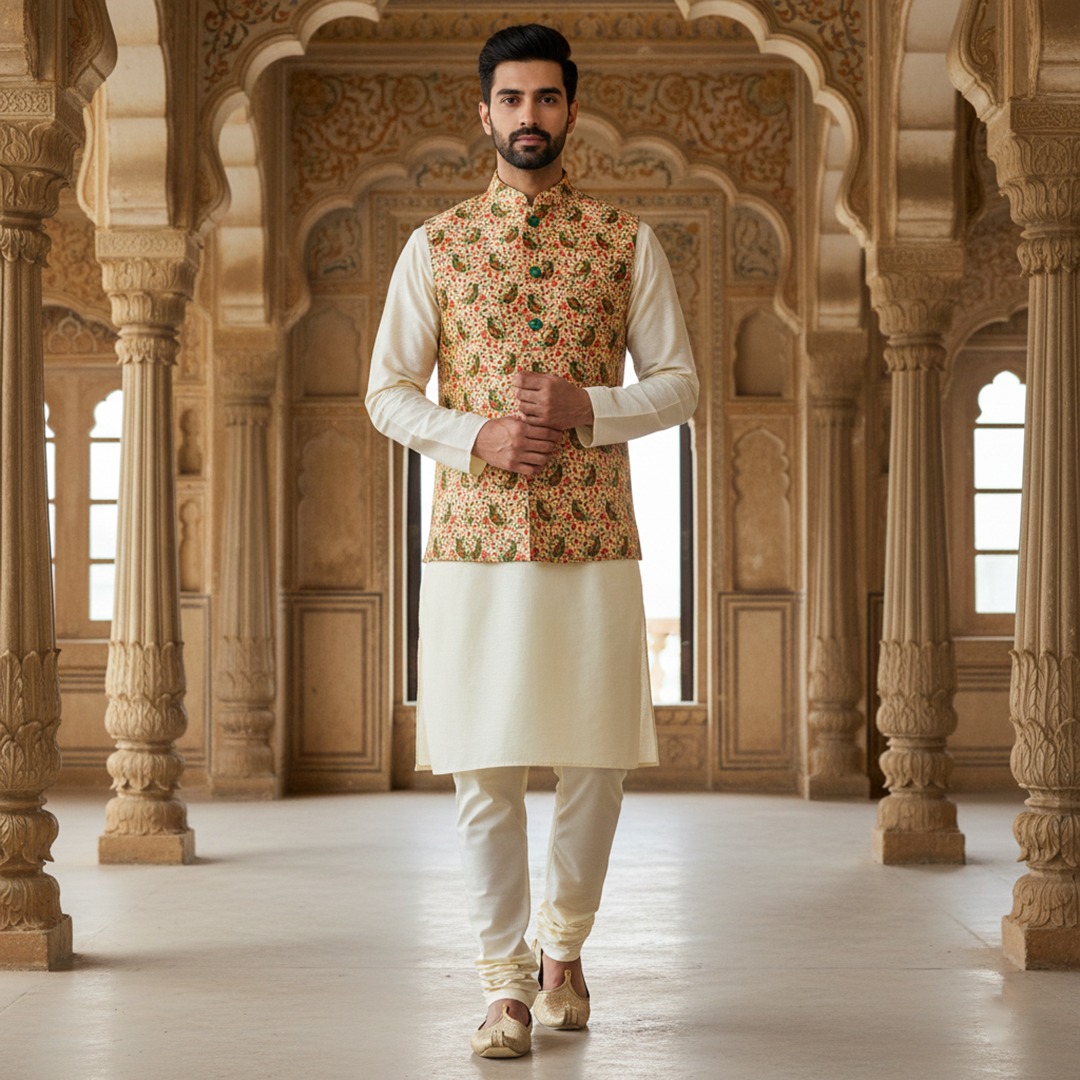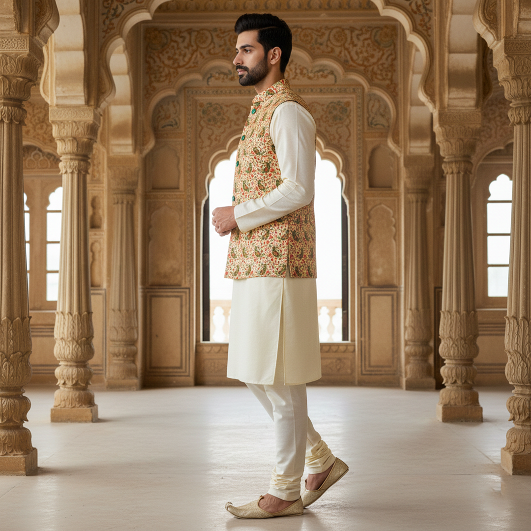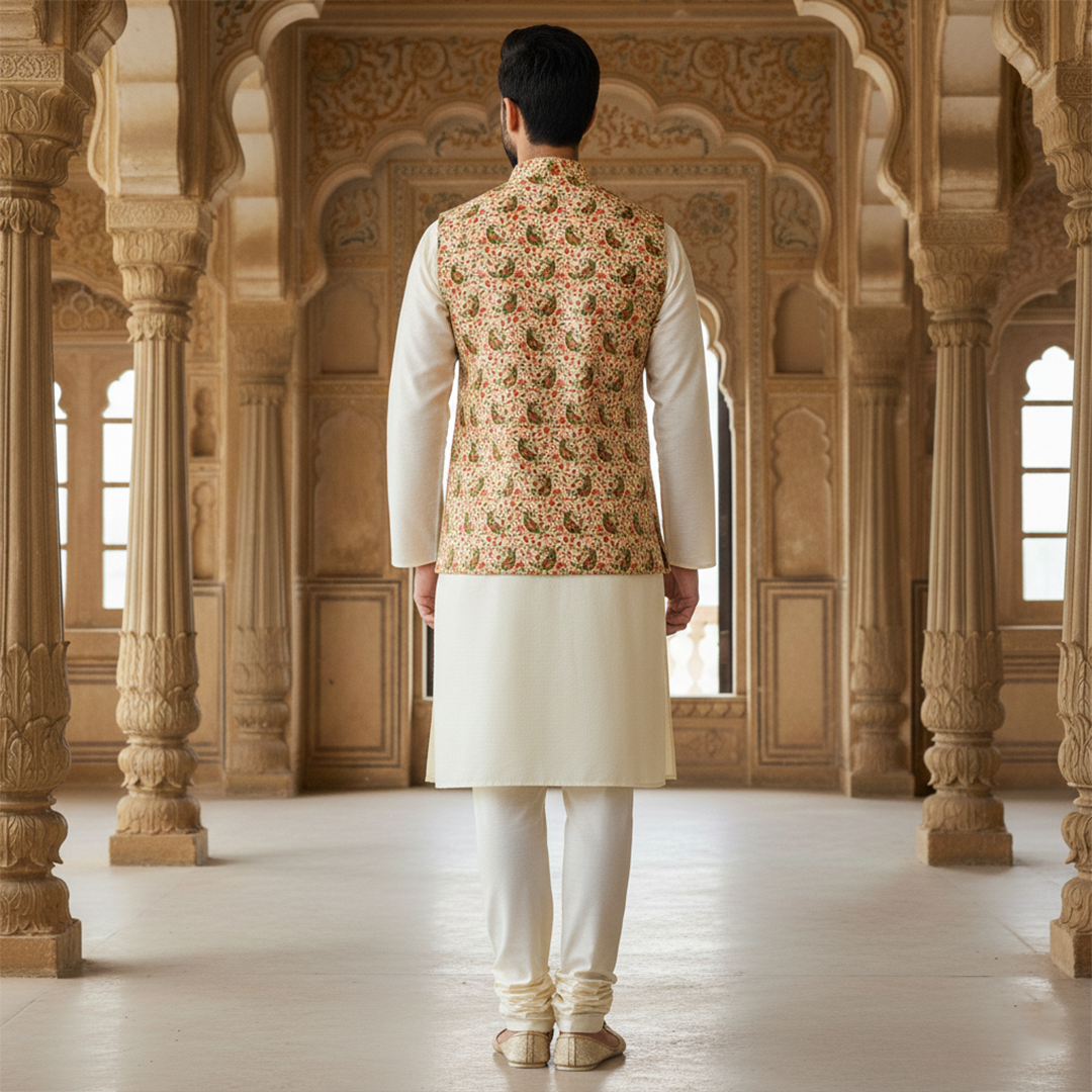 jacket paired with a classic ivory kurta pajama. Designed