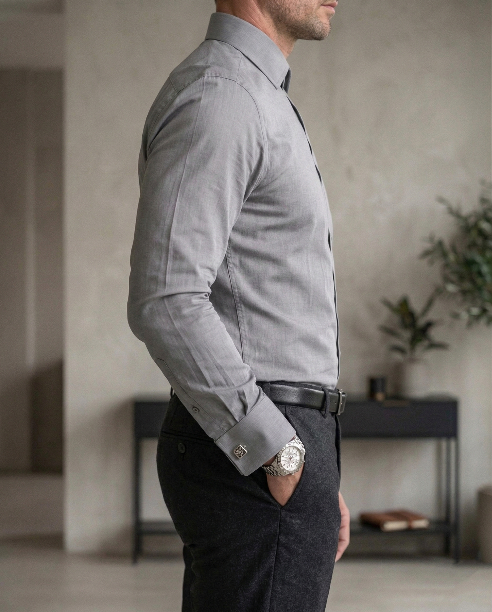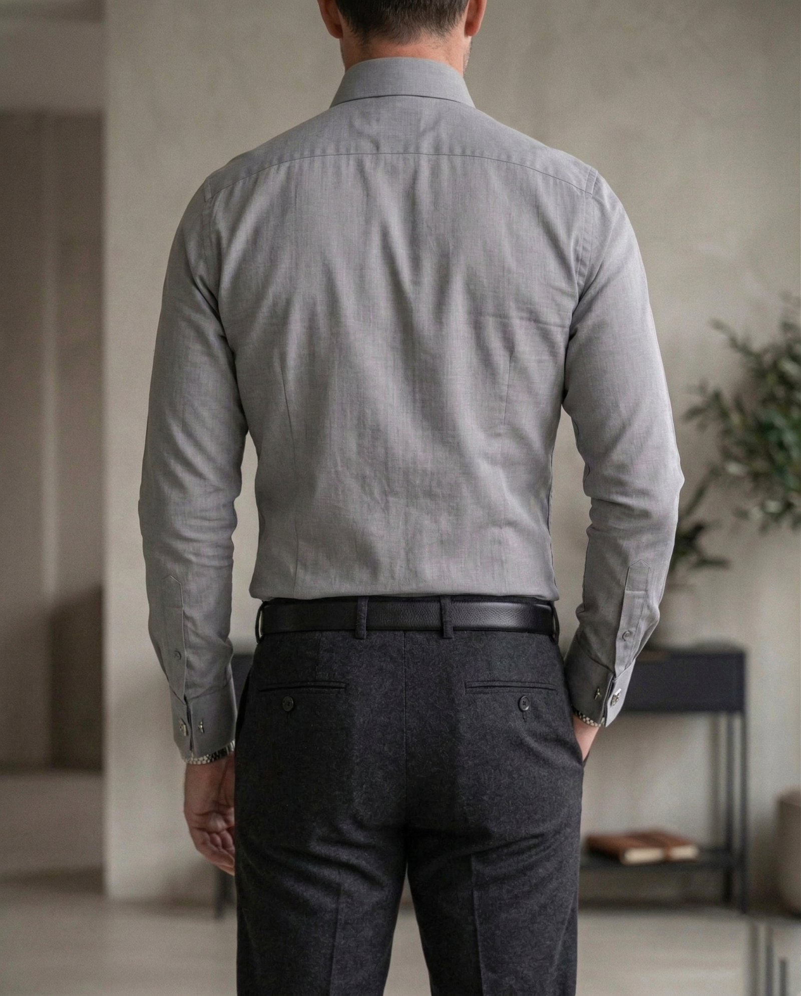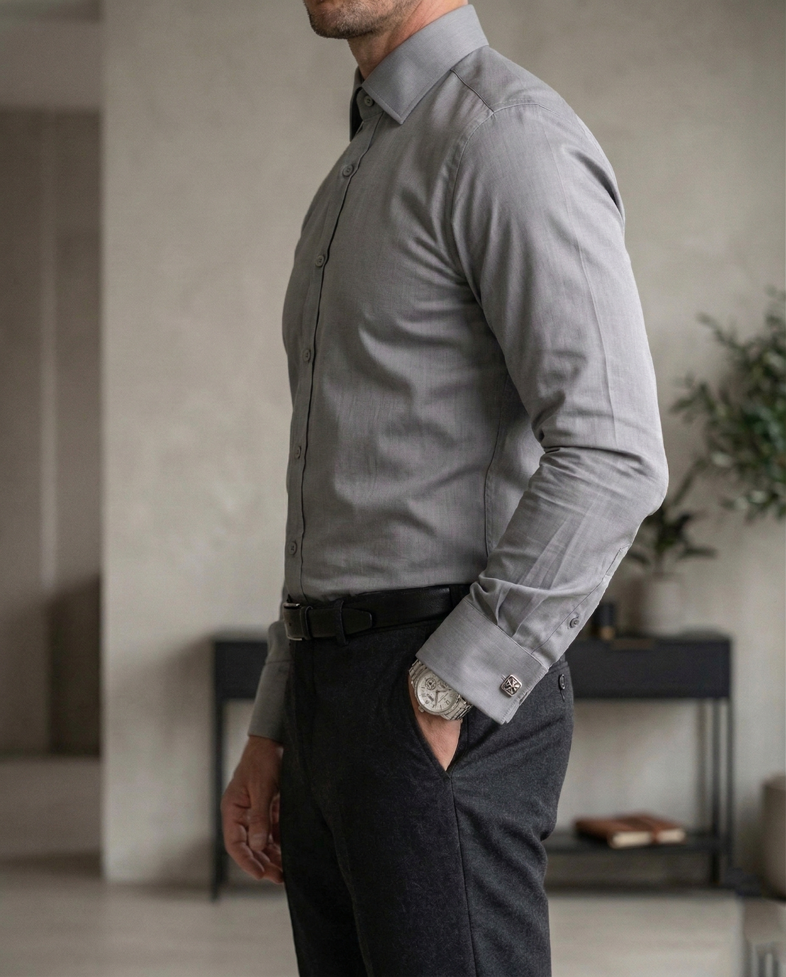 The slim fit design with a sharp collar and clean stitching provides a polished and professional appearance. The classic grey color adds a refined and versatile touch, making it perfect for office wear, business meetings, formal events, and evening occasions.