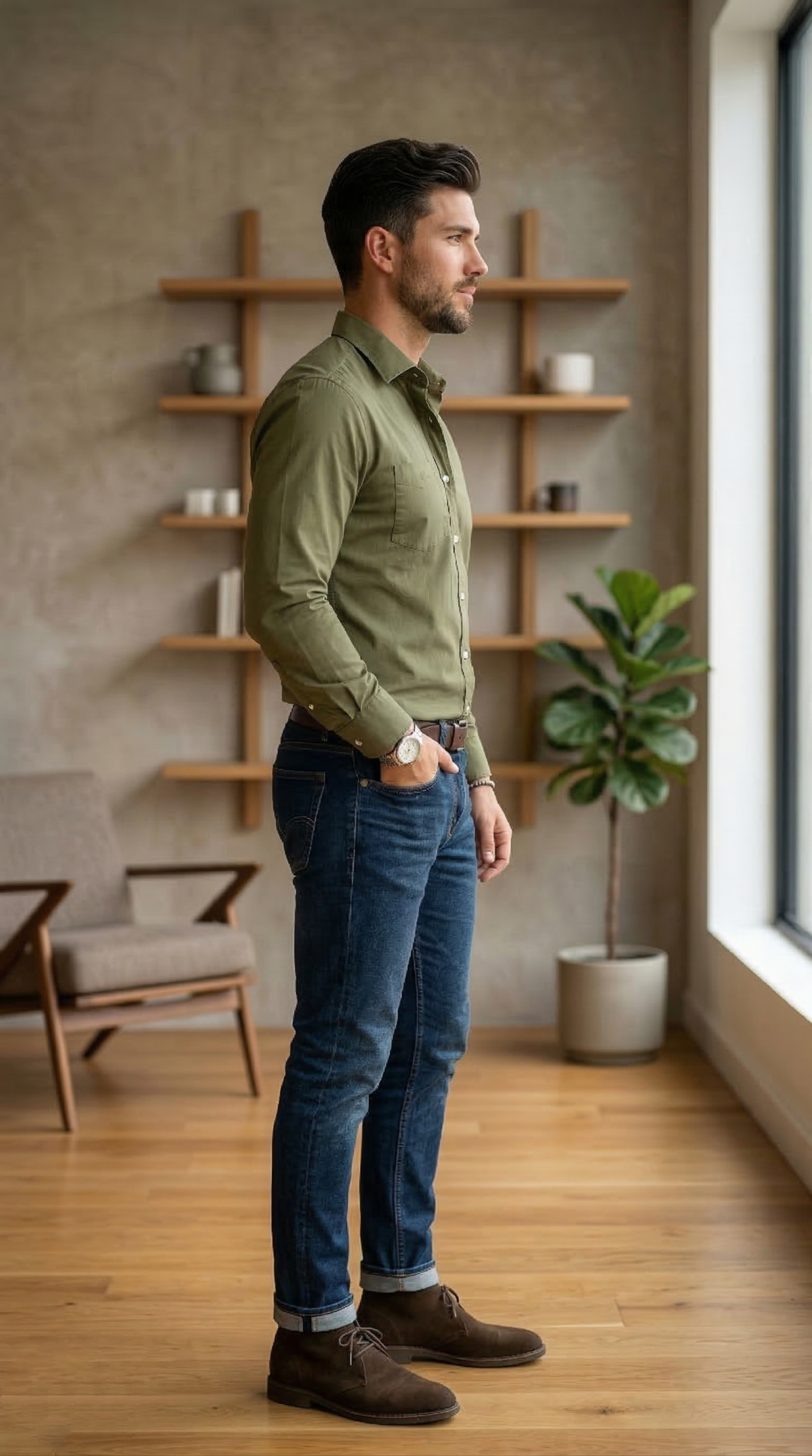 Master the art of understated style with our Men’s Casual Olive Button-Down. This shirt is crafted from a crisp, lightweight cotton poplin that offers a clean look without feeling stiff. The deep olive-green hue provides a sophisticated alternative to traditional neutrals, making it a perfect casual staple for any season. Tailored for a sharp, slim-fit silhouette, it features a classic spread collar and a single patch pocket, ensuring you look polished whether you’re at a casual brunch or a creative office meeting.
