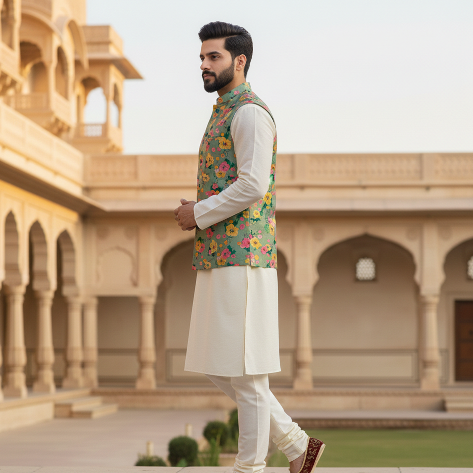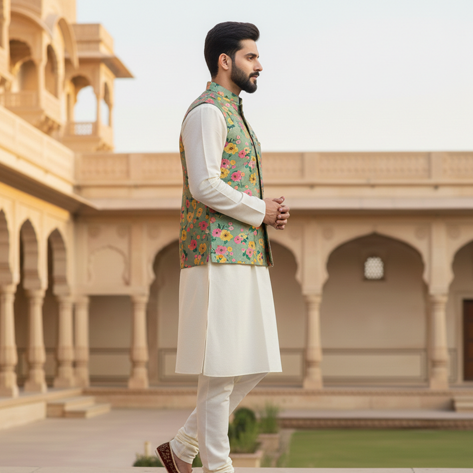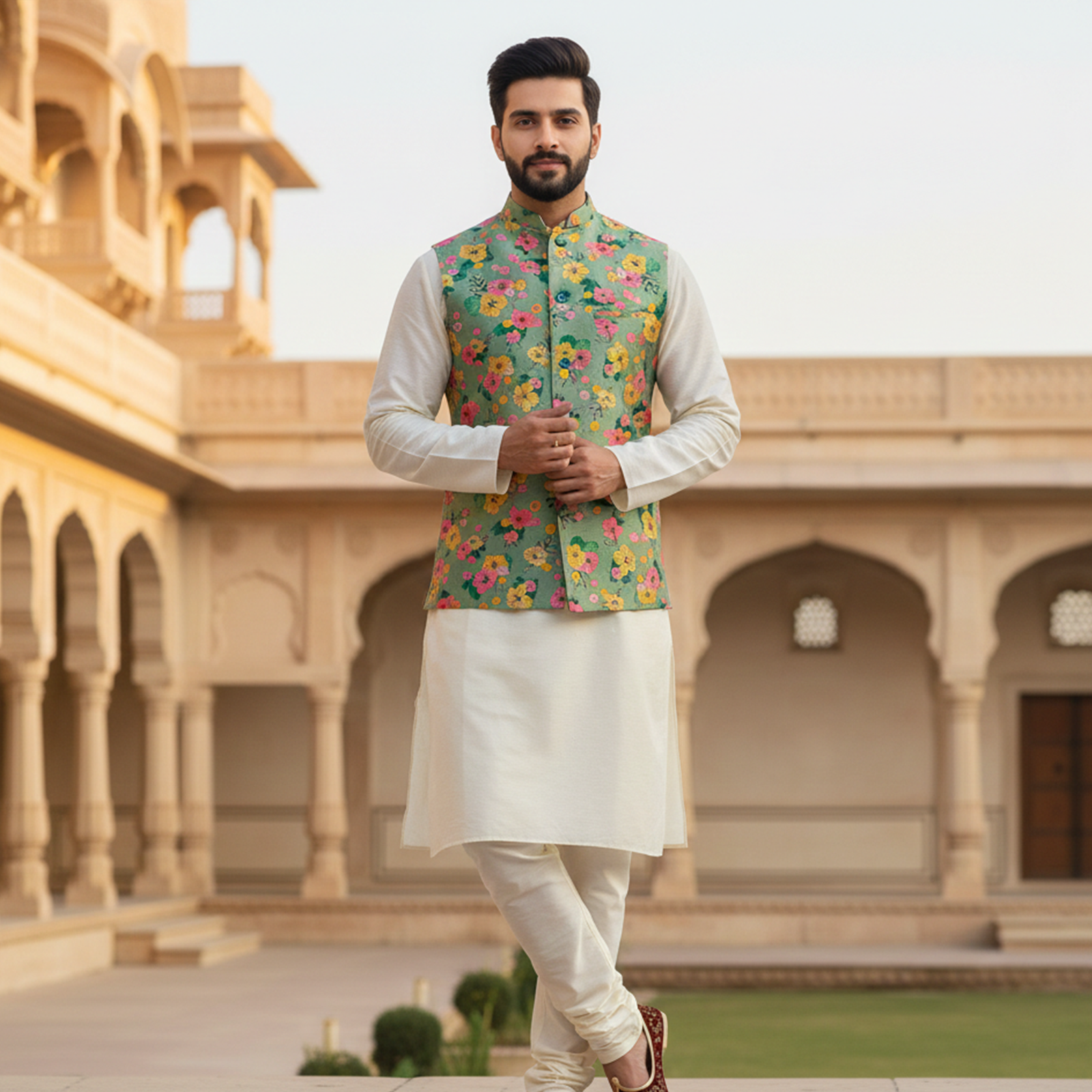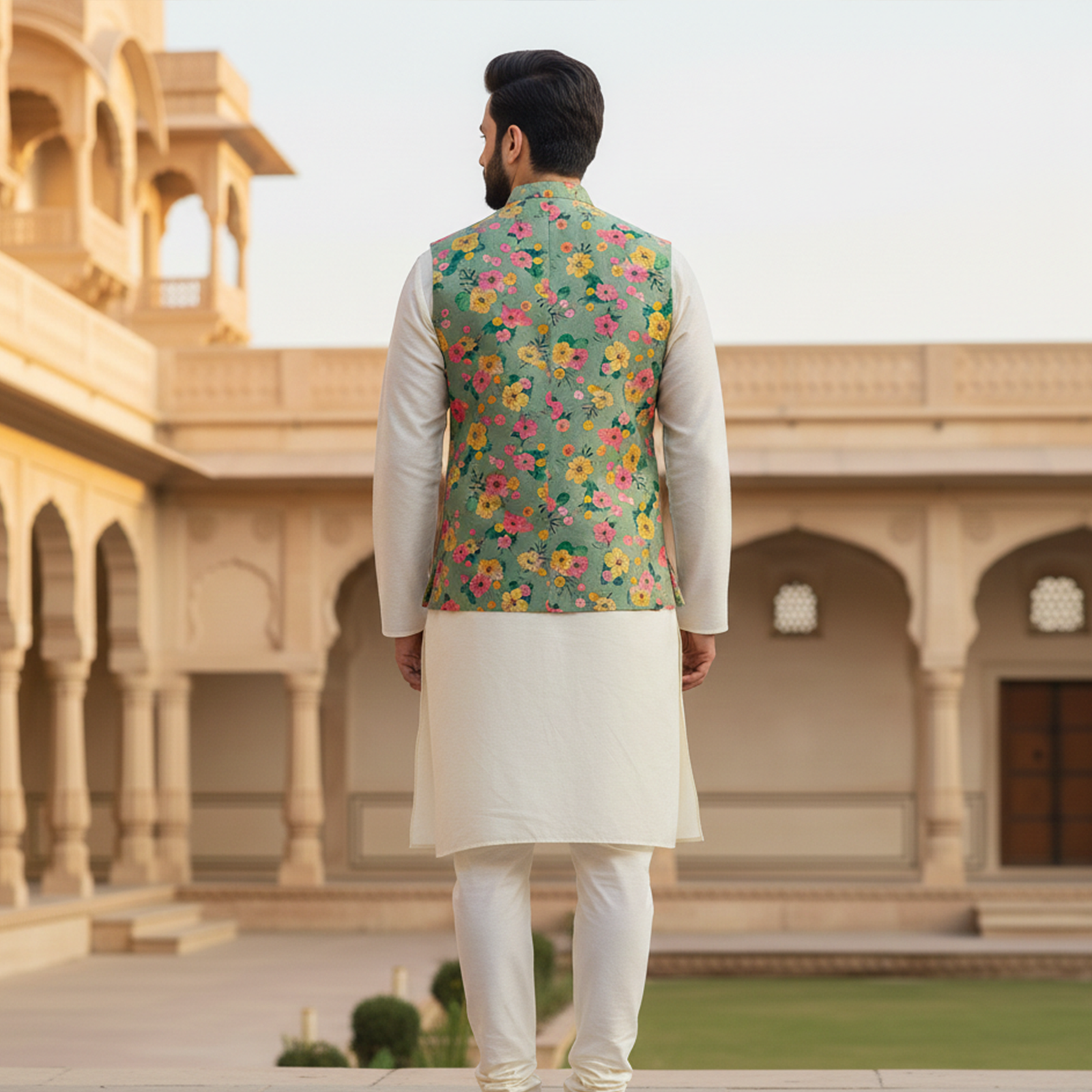 with a classic ivory kurta pajama. Designed with delicate multicolor floral motifs, the jacket