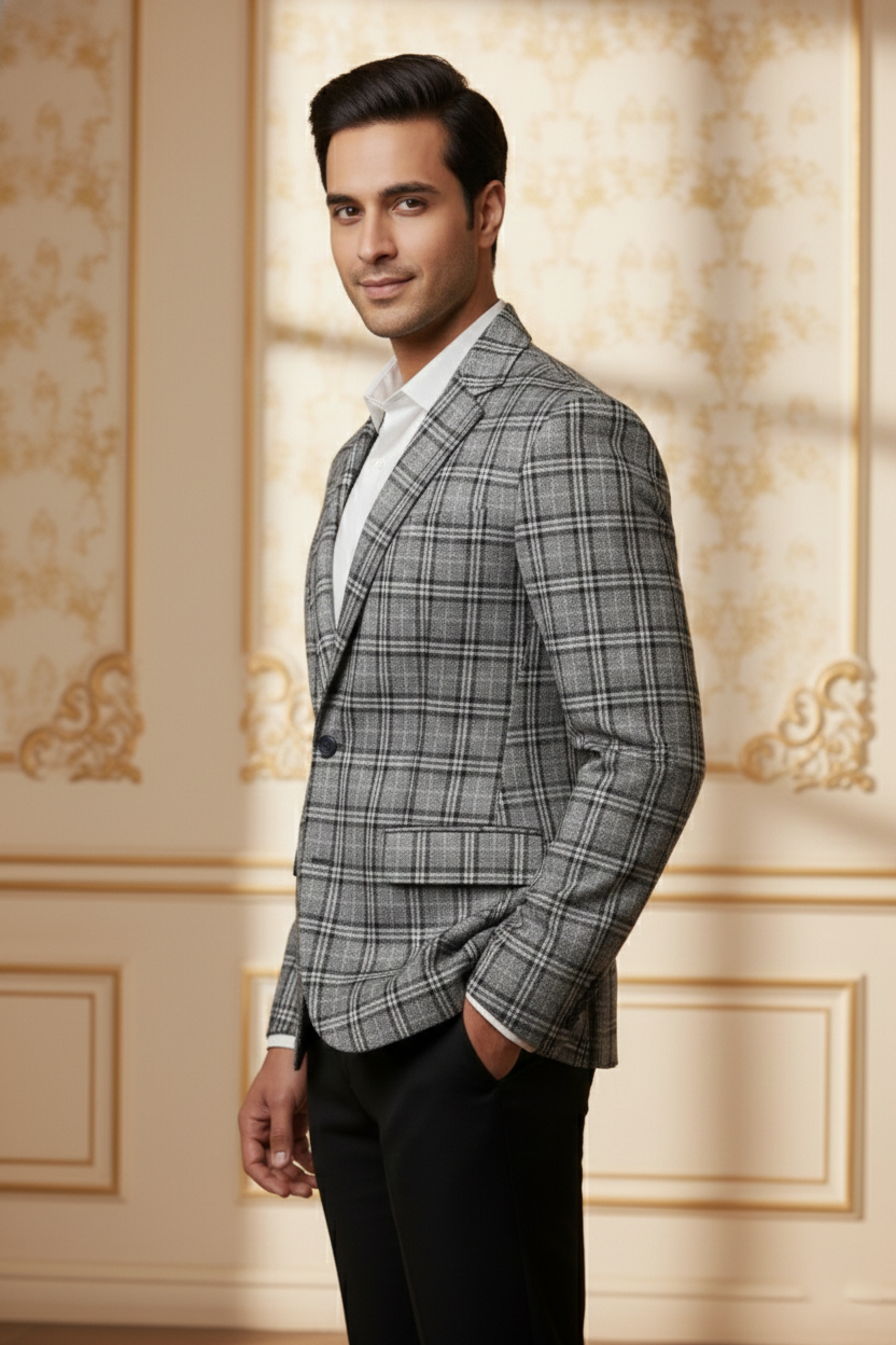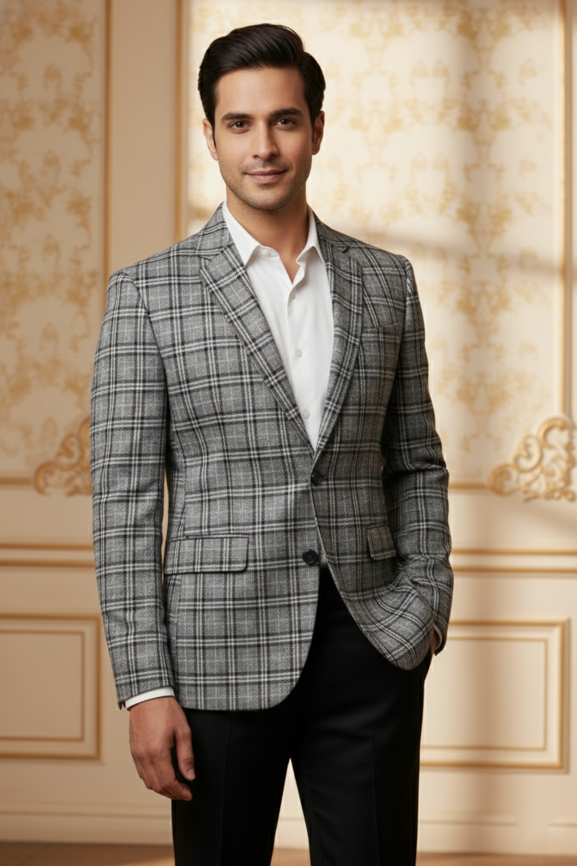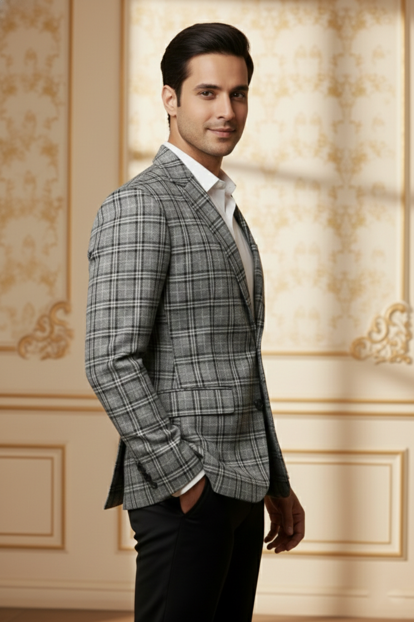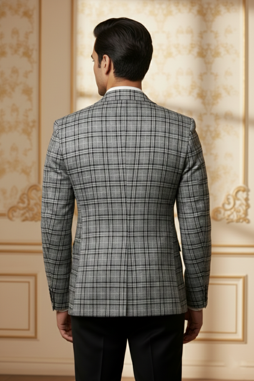 Timeless pattern meets modern precision. This grey glen plaid (Prince of Wales check) blazer is the epitome of classic sartorial style. Featuring a subtle interplay of grey tones and fine black linework, this jacket adds a layer of sophisticated texture to your formal wardrobe. It is an ideal choice for the modern professional seeking a versatile piece that works as well in the boardroom as it does at a wedding reception.