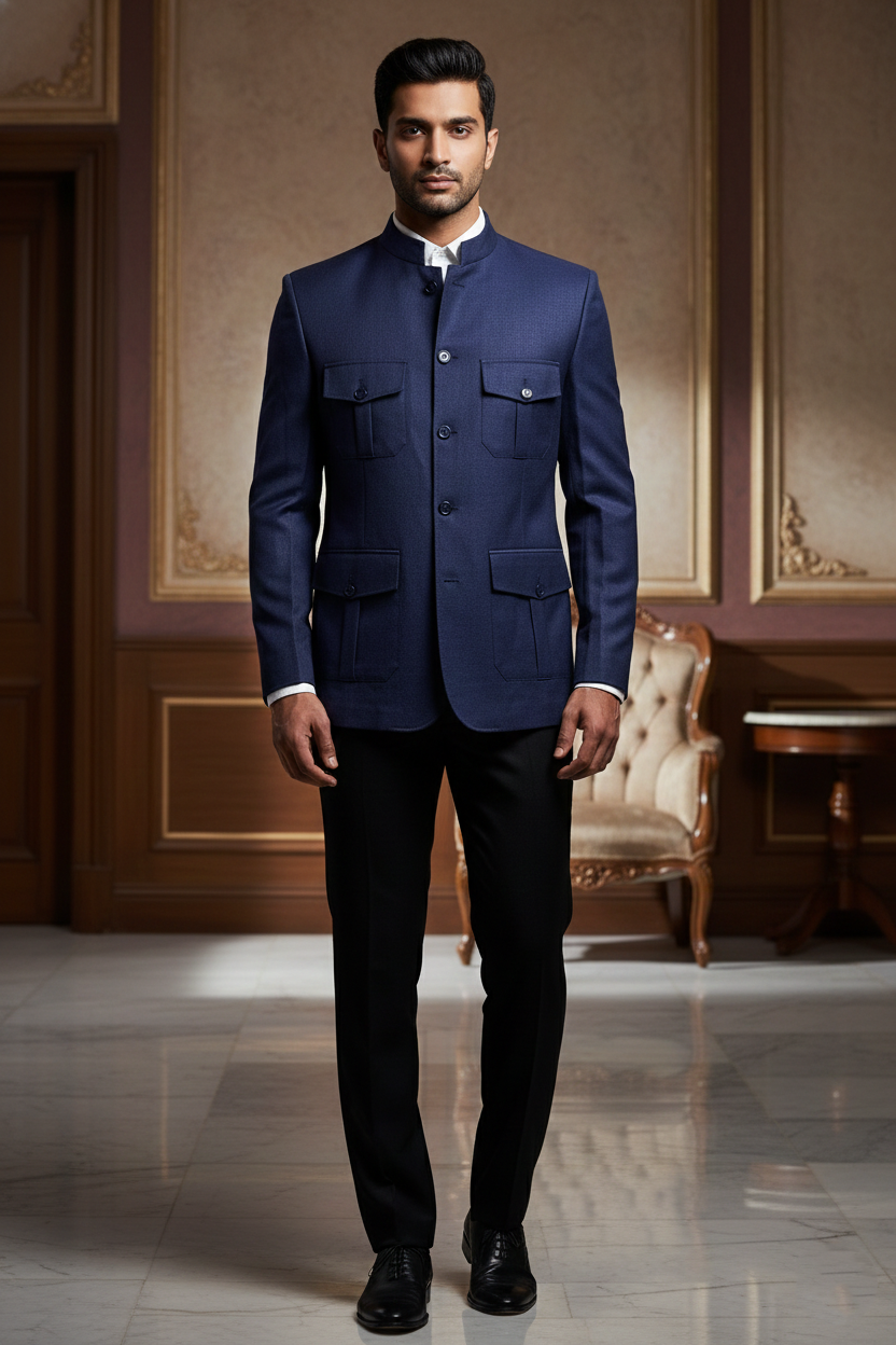 Redefine heritage with a modern military edge. This sophisticated navy blue Bandhgala jacket combines the structured grace of traditional Indian attire with the functional aesthetic of a classic safari jacket. Crafted for the modern man who values both style and utility, this piece is an exceptional choice for semi-formal weddings, festive gatherings, or upscale evening events.