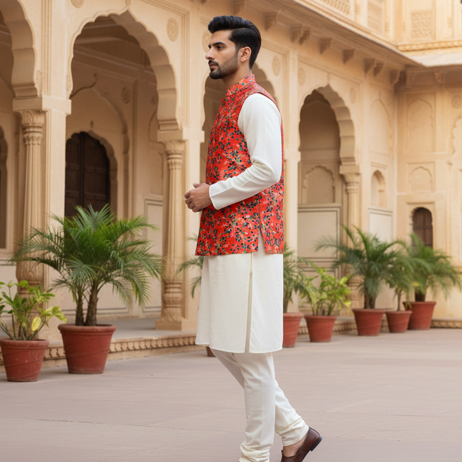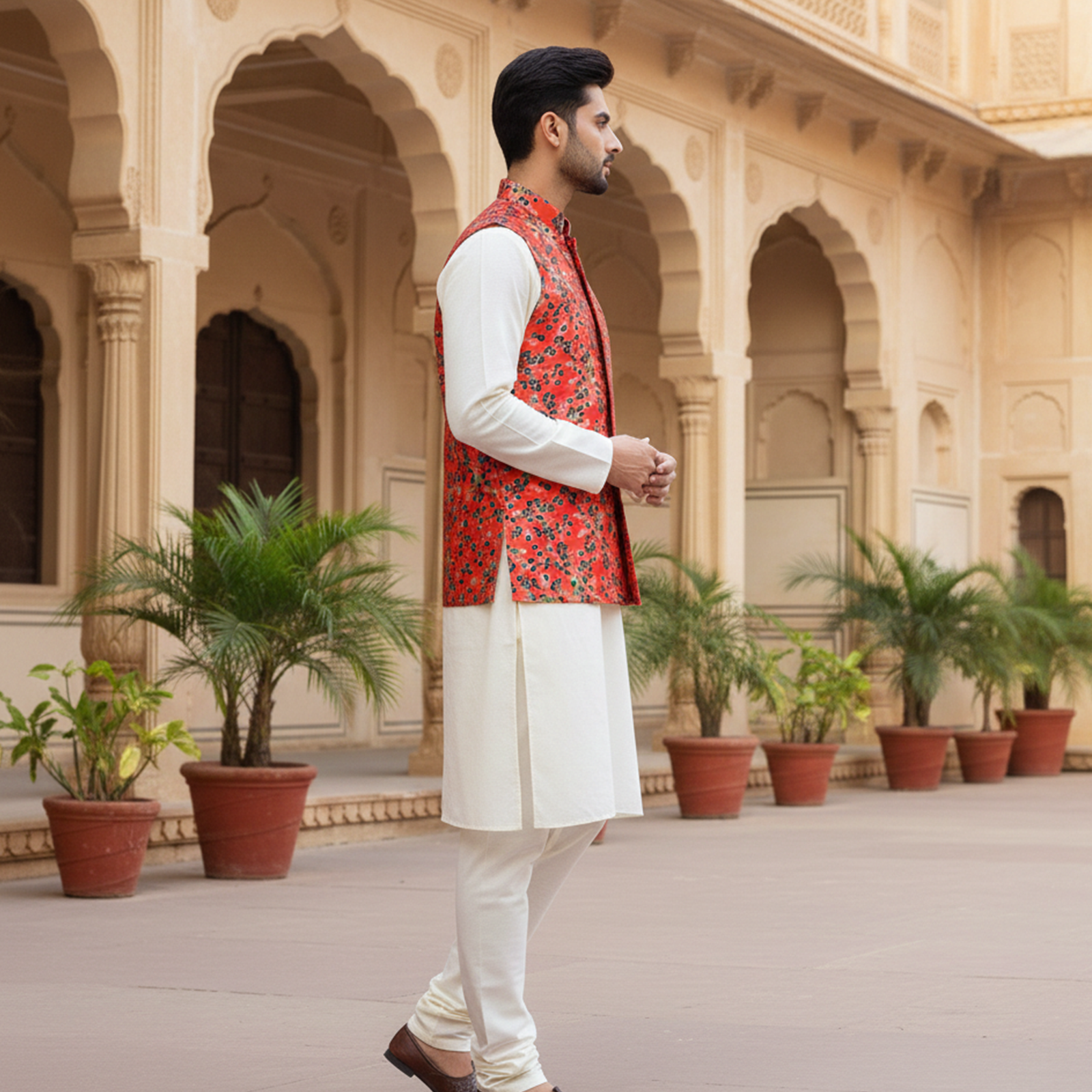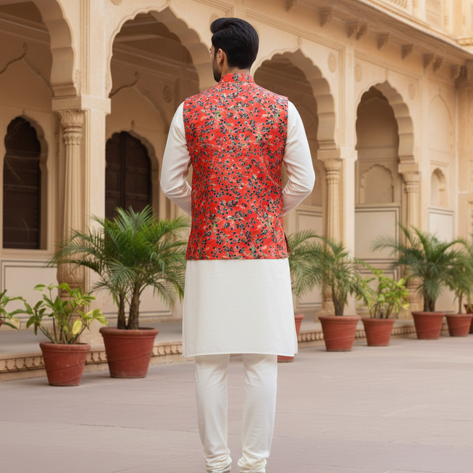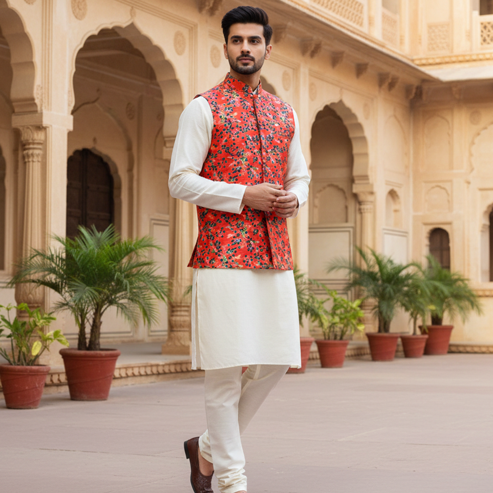 Elevate your festive wardrobe with this striking red floral Nehru