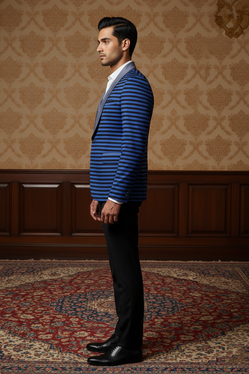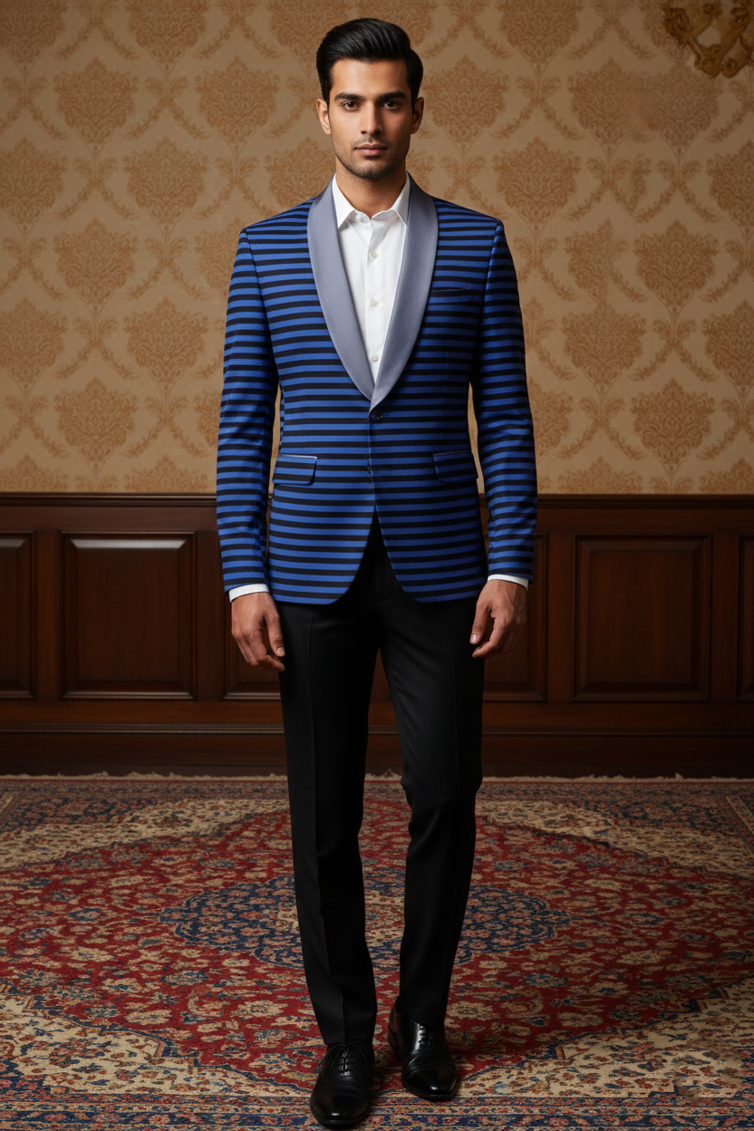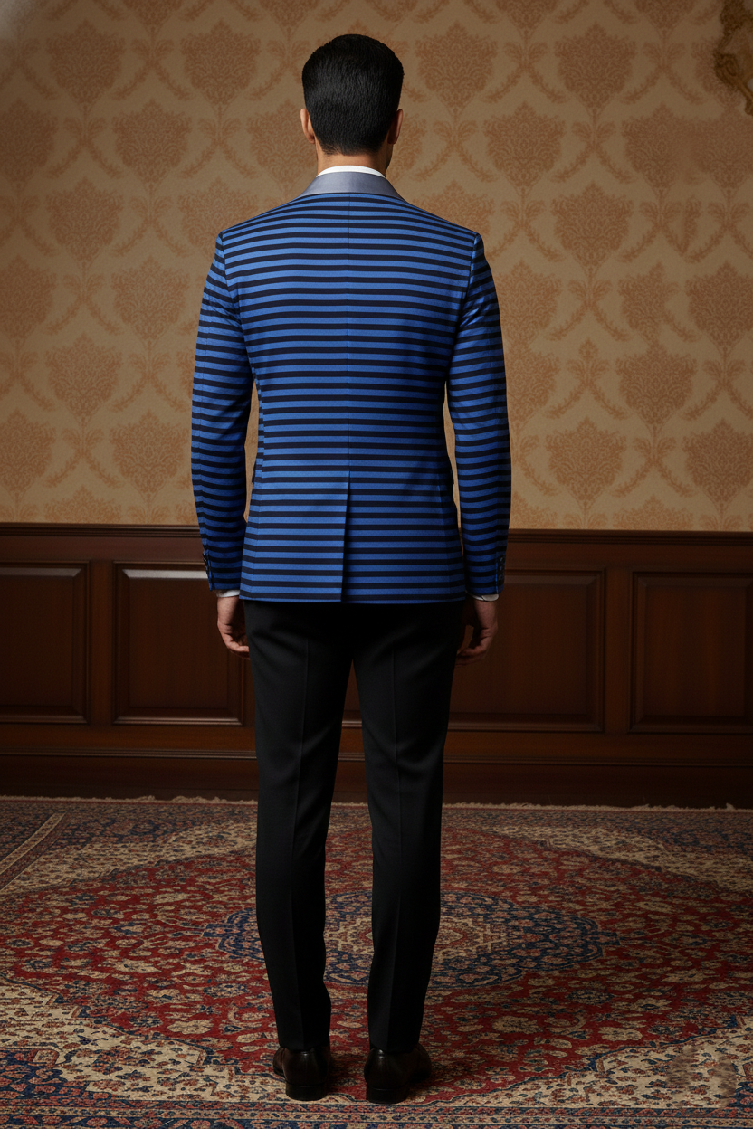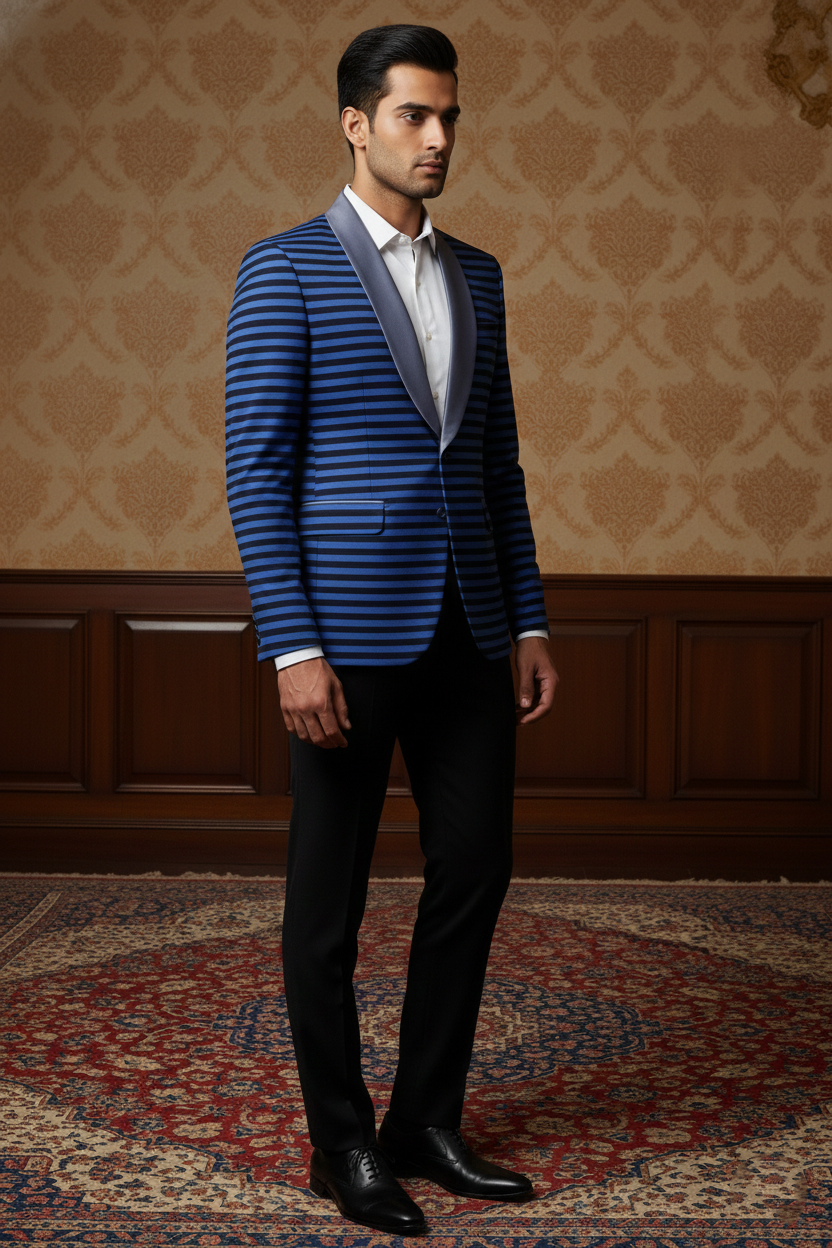 Redefine contemporary evening wear with a dash of architectural bold. This striking blazer features a rhythmic horizontal stripe pattern in deep cobalt blue and jet black. The design is anchored by a smooth, slate-grey satin shawl lapel, creating a luxurious contrast that elevates the jacket from a simple fashion piece to a high-end statement garment. Whether it’s a creative black-tie event, a red-carpet appearance, or an upscale party, this blazer is engineered to make an unforgettable impression.