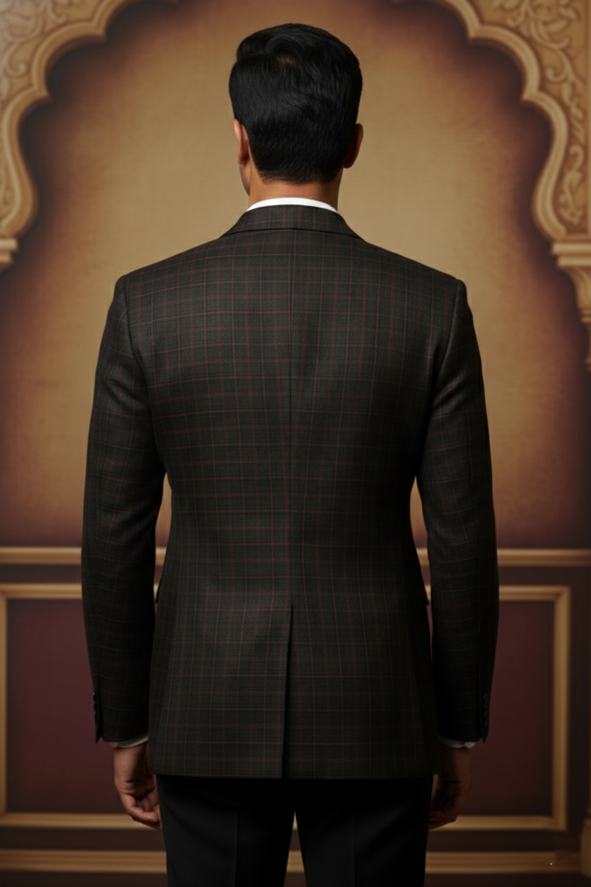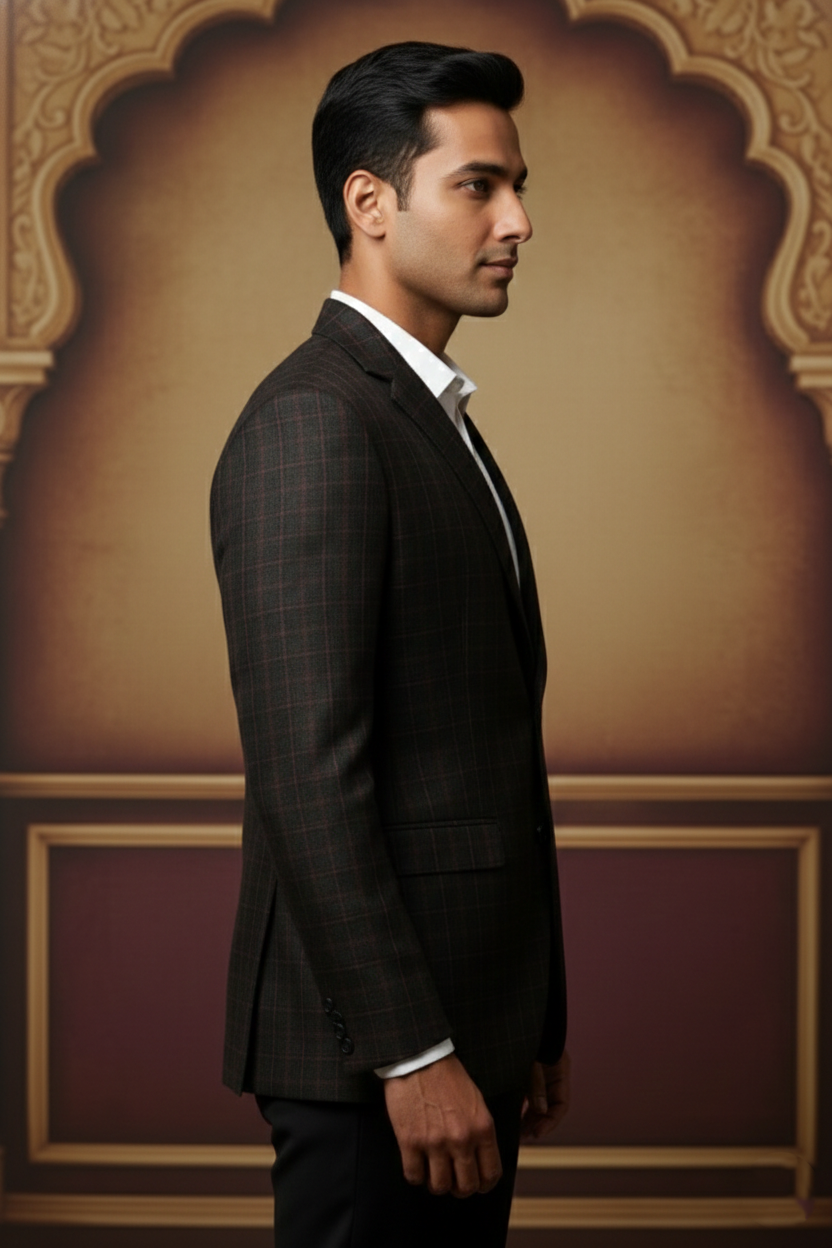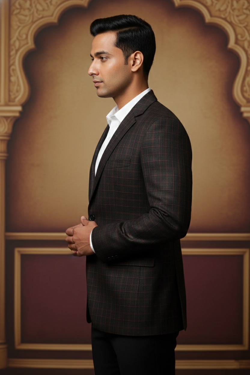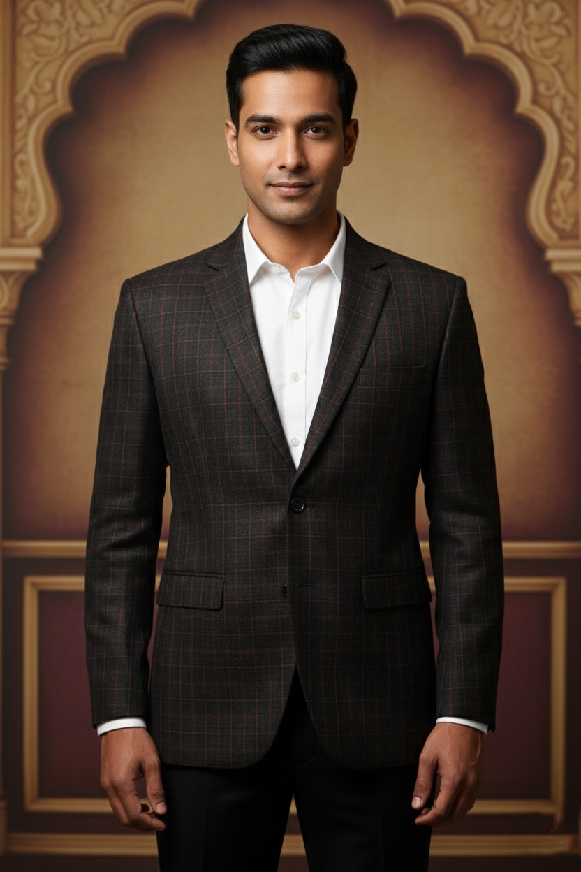 Elevate your formal wardrobe with this impeccably tailored windowpane check blazer. The deep, dark base is accented by a subtle rust-toned grid, offering a rich visual texture that is both professional and distinctive.