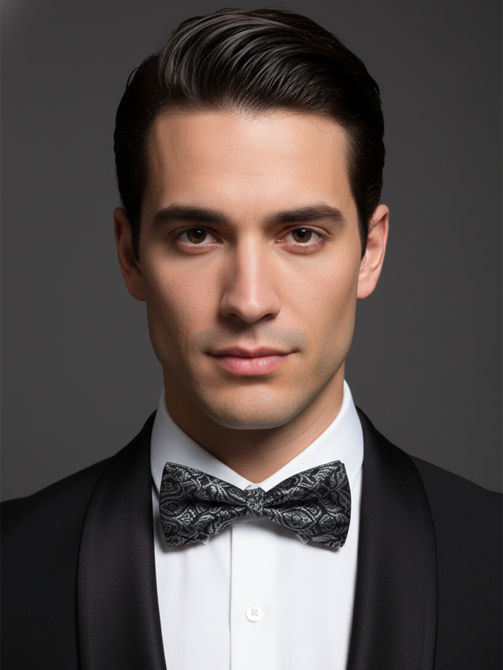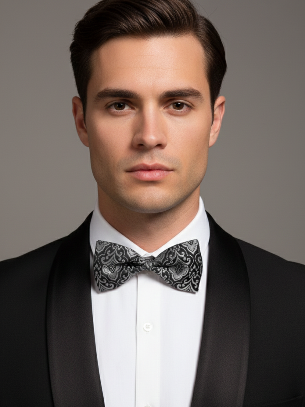 The design features a seamless interplay of deep midnight black and cool charcoal gray, often rendered in a subtle texture?like a herringbone or jacquard weave?that catches the light just enough to add dimension. It?s a versatile powerhouse; it pairs effortlessly with a crisp white shirt for a high-contrast pop or a light gray shirt for a sleek, monochromatic vibe. Crafted from premium materials that hold their shape from the first toast to the last dance, this bow tie ensures you look sharp, structured, and undeniably refined.