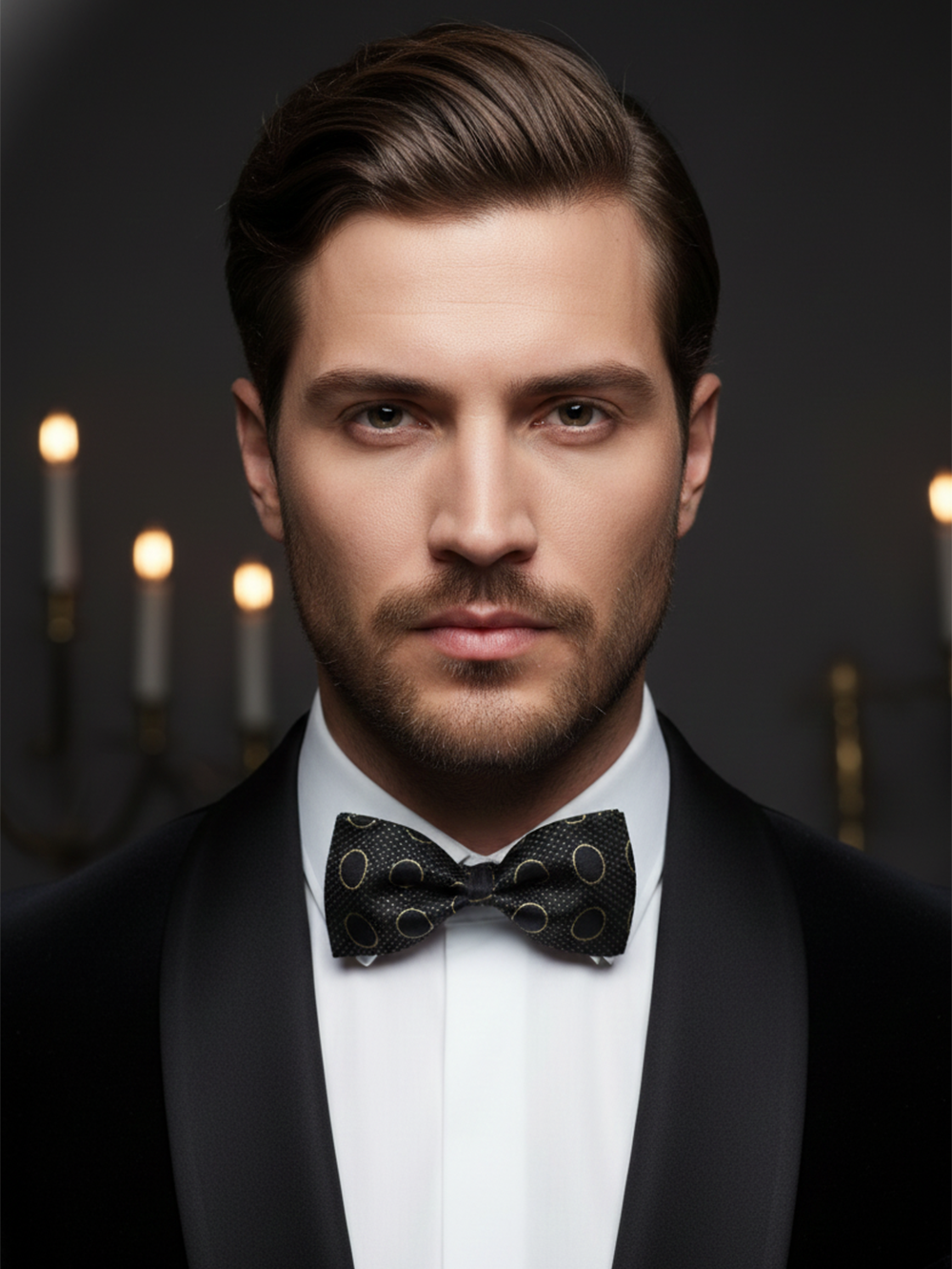 Step into the spotlight with an accessory that defines “Executive Elegance.” This bow tie is the ultimate statement piece for those who demand a look that is both authoritative and opulent. Featuring a jet-black matte base adorned with shimmering metallic gold detailing, it captures the essence of a high-end gala or a prestigious awards night.