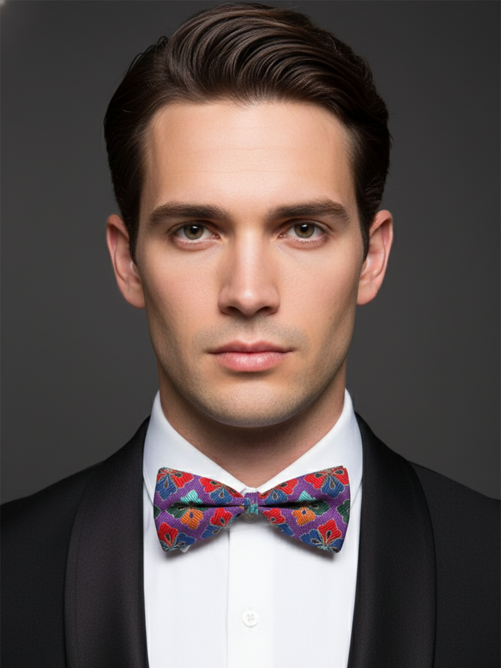 The Technicolor Mosaic bow tie is a bold manifesto of personality and creative flair. Far from the constraints of single-tone formalwear, this accessory features a high-definition multi-color print that weaves together an array of vivid hues. With a palette that spans electric blues, fiery oranges, and deep violets, the design mimics the intricate patterns of a digital tapestry or a contemporary stained-glass installation.