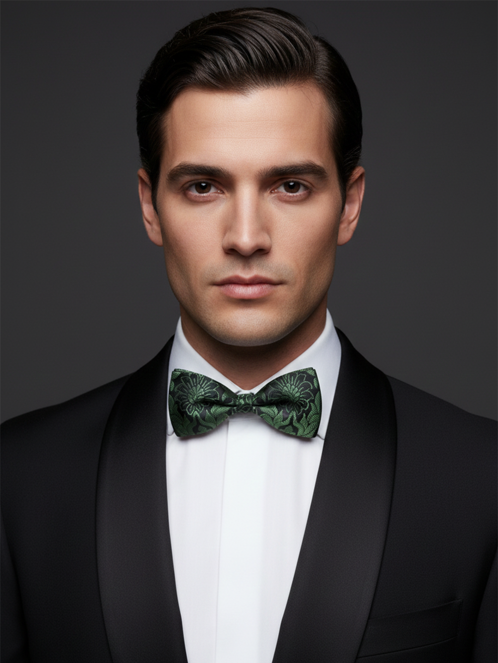 The Verdant Noir bow tie is a masterclass in understated luxury, featuring a dark green shade so deep it flirts with the shadows of midnight. This forest-inspired hue offers a refreshing alternative to traditional black, providing a sophisticated “hidden color” effect that reveals its true richness only when caught in the right light. It is the color of old-world libraries and pristine coniferous forests, evoking a sense of stability, growth, and refined taste.